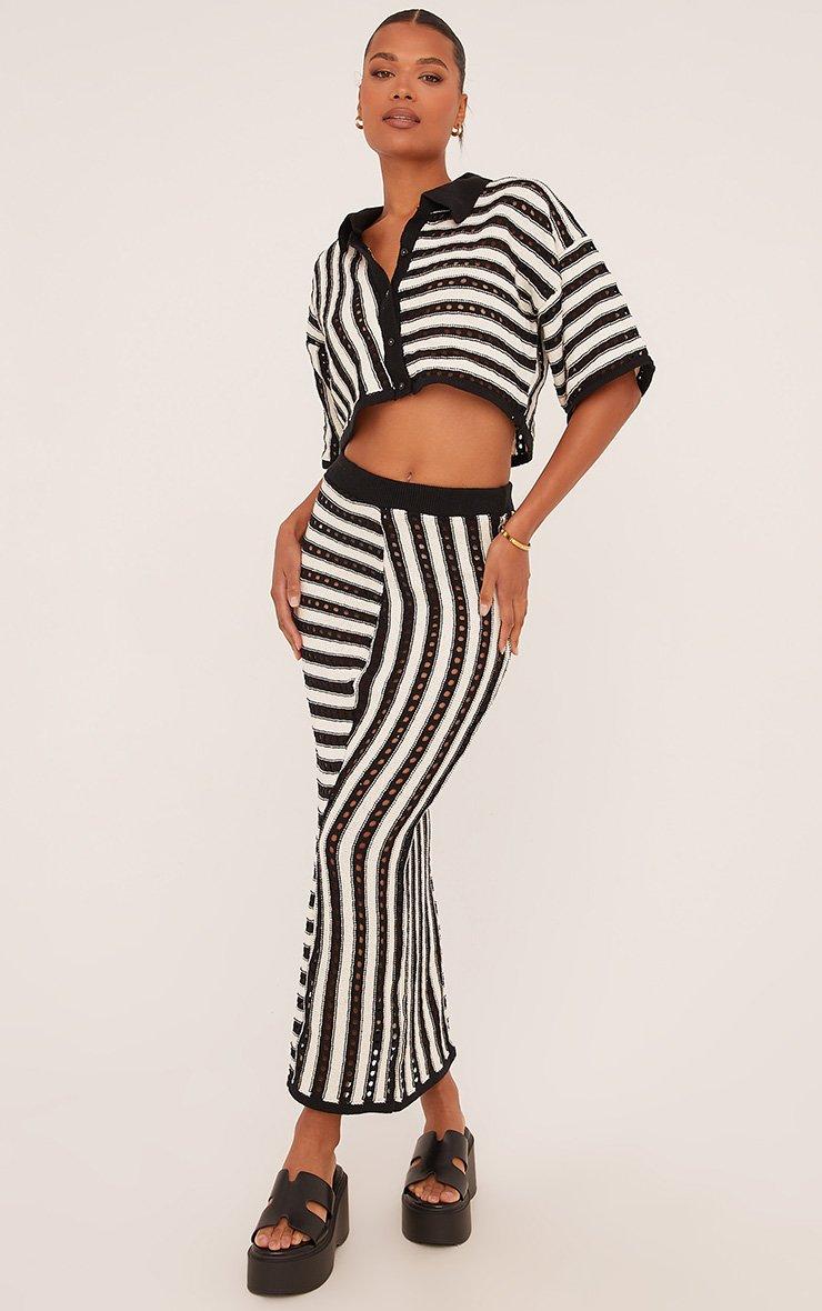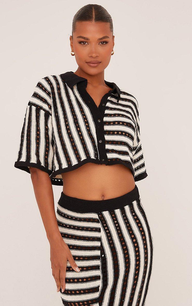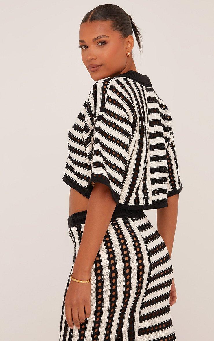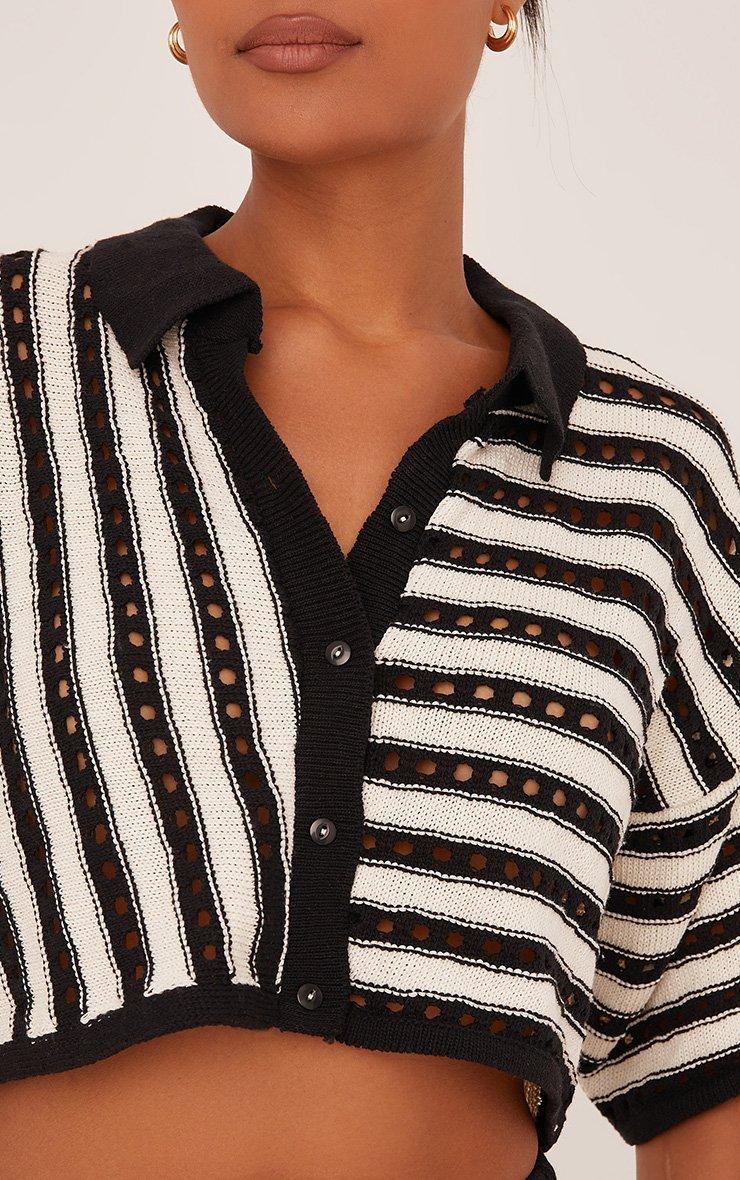 Short Sleeve Button Front Cropped Shirt In Black Stripe Knit