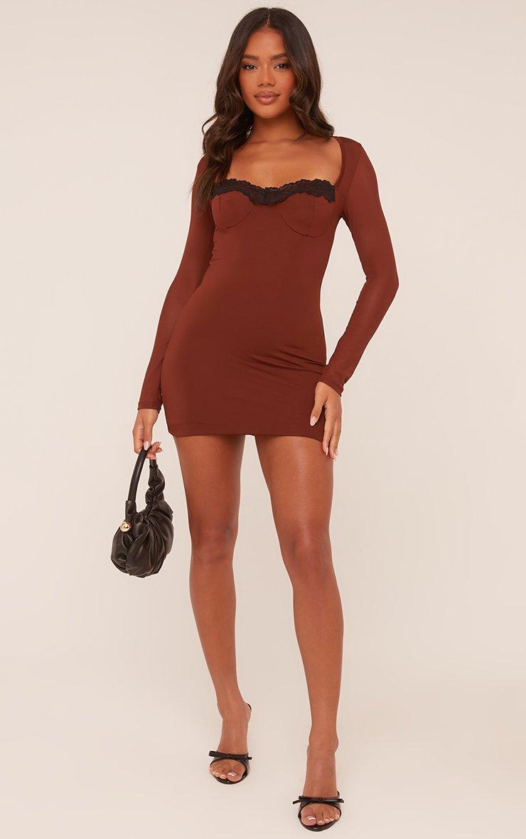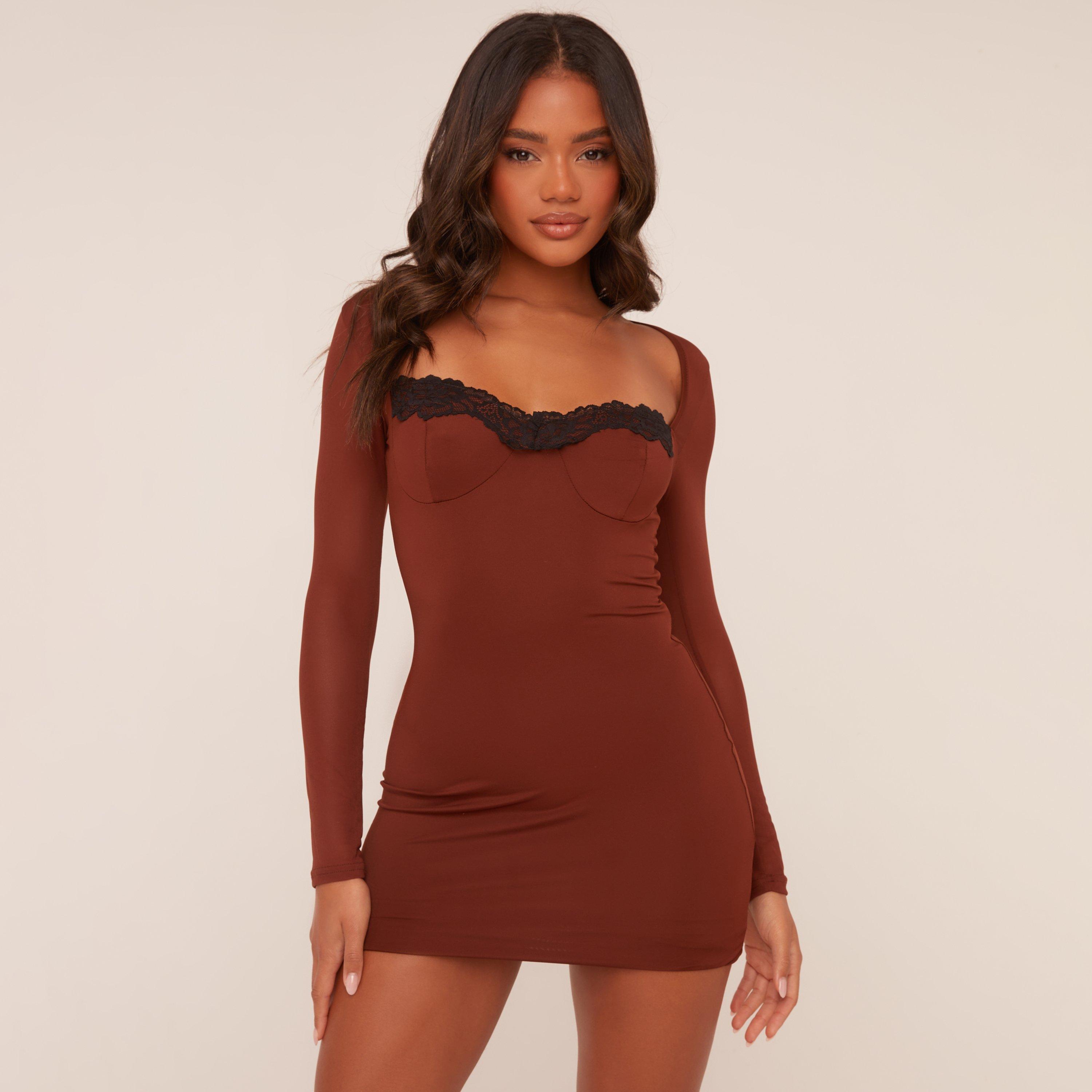 Long Sleeve Underwired Lace Trim Detail Mini Bodycon Dress In Brown Slinky