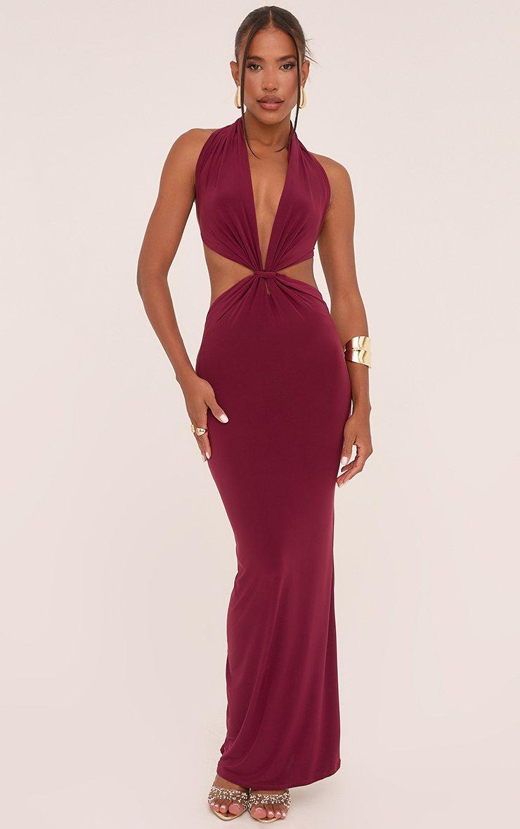 Heading out for a glam night with the girls? Featuring a luxurious wine slinky fabric with stunning plunge halterneck detailing and a chic knot front, this maxi dress is all about elegance and sass. Perfect for strutting your stuff in style, just add your fave heels and statement earrings. Get ready to steal the spotlight, doll!