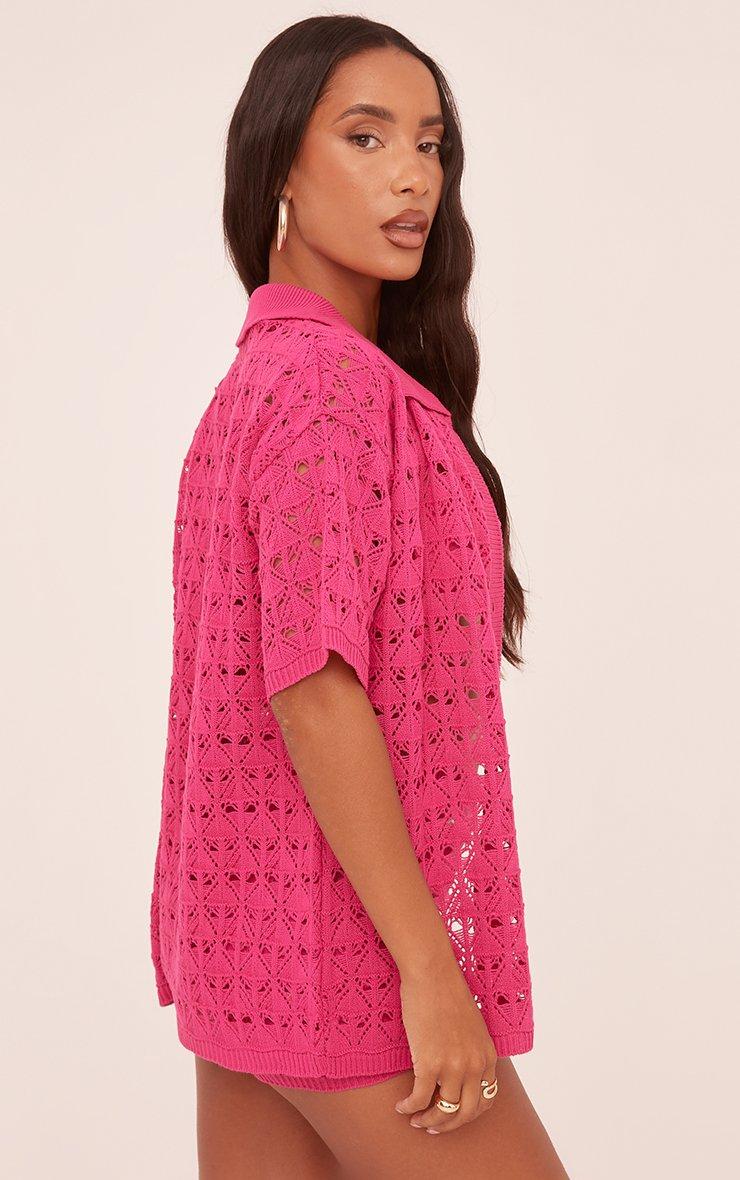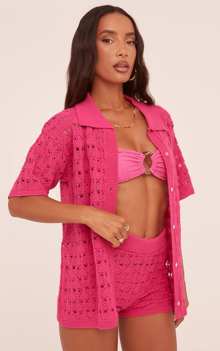 Make a bold statement with these hot pink crochet shorts. The vibrant hot pink hue and striking geometric crochet pattern are perfect for turning heads. Pair these mid-rise shorts with the matching crochet shirt, oversized sunnies and statement sandals for an unbeatable summer look.