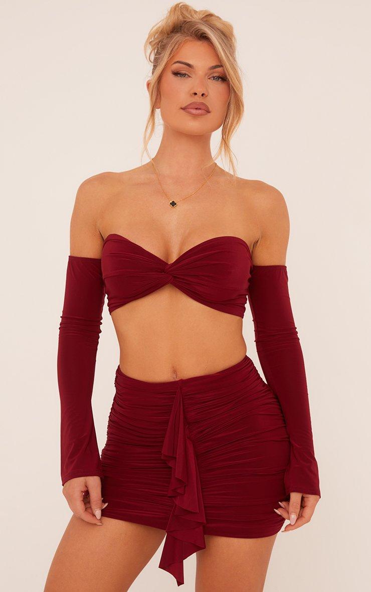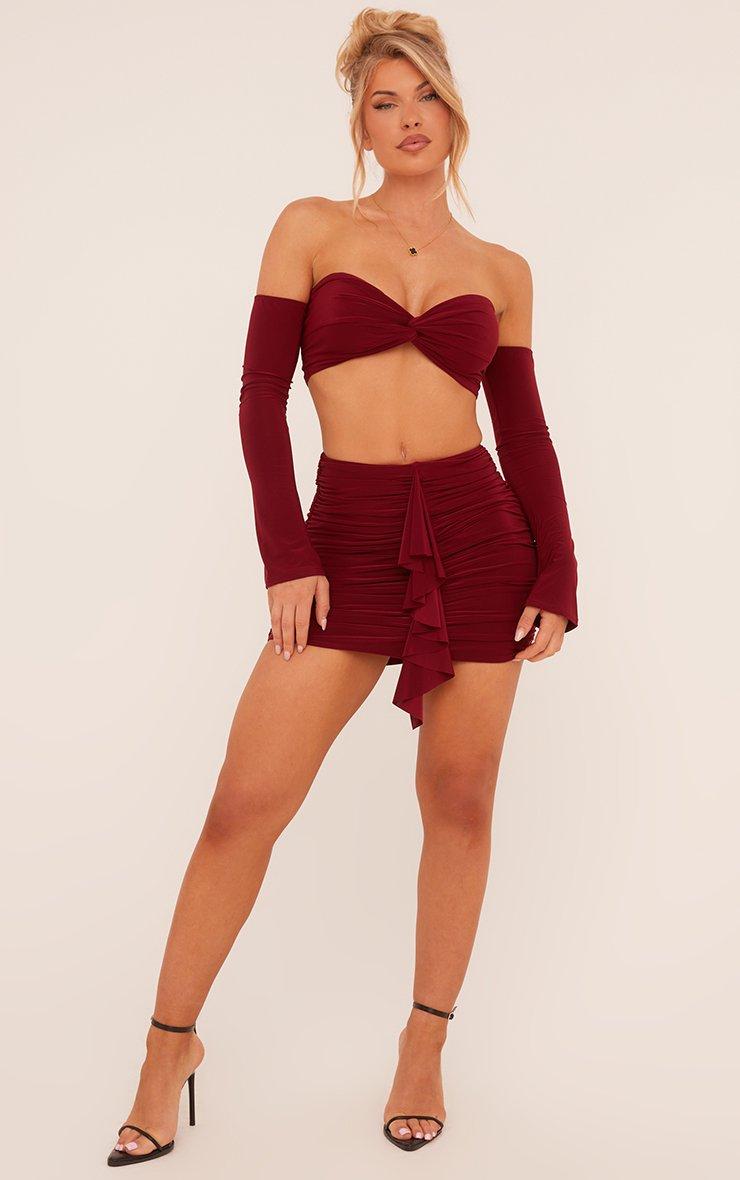 Keep things sultry and full of drama in this High Waist Frill Front Mini Bodycon Skirt In Wine Slinky. This burgundy skirt is all about creating a captivating silhouette with its dramatic frill detail and flattering ruched style. The rich burgundy tone was designed to wow while the slinky fabric, high waist and bodycon fit highlight your flawless curves. Whether it's date night or girls night, this mini skirt is sure to get hearts racing!