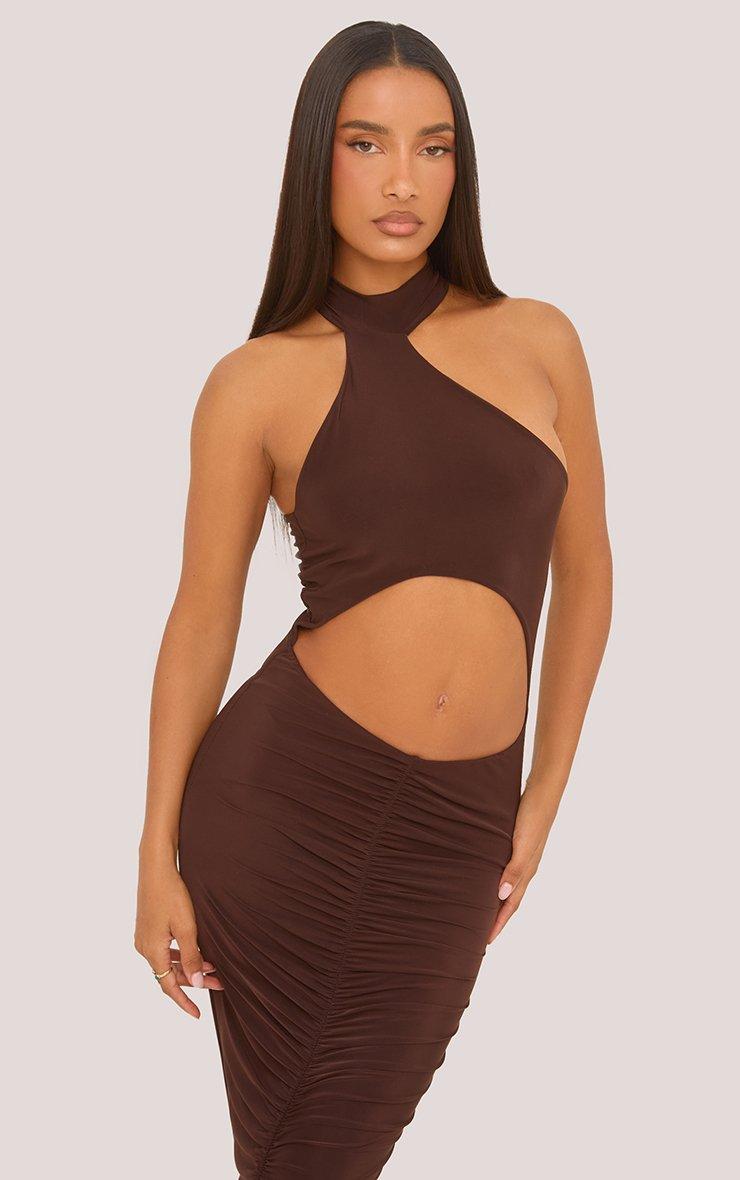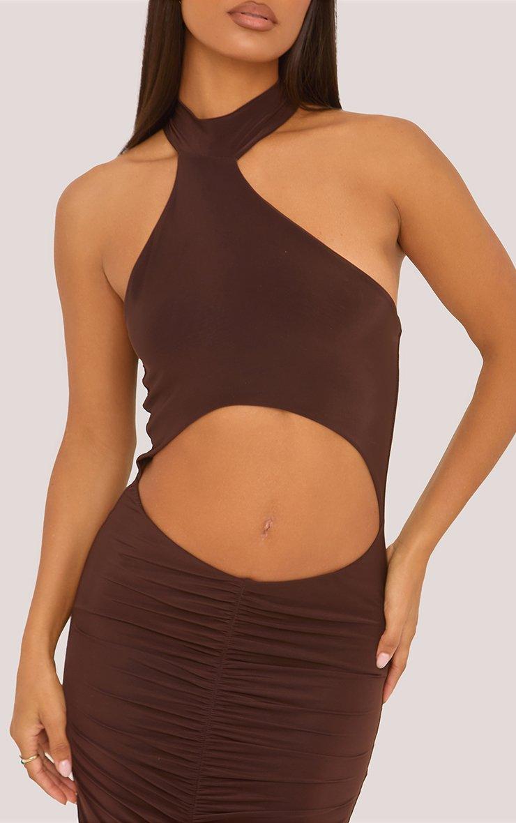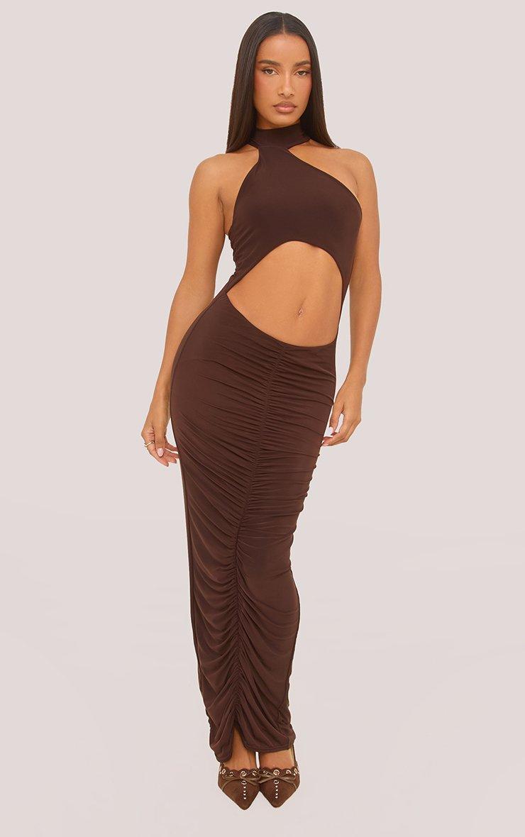 Serve up serious glam in our High Neck Cut Out Front Maxi Dress in Chocolate Brown Slinky. This brown slinky maxi dress is serving chic and sexy with its high neck, ruched detailing and daring cut out front. Crafted from a chocolate brown slinky fabric, this maxi dress is all about making a statement.