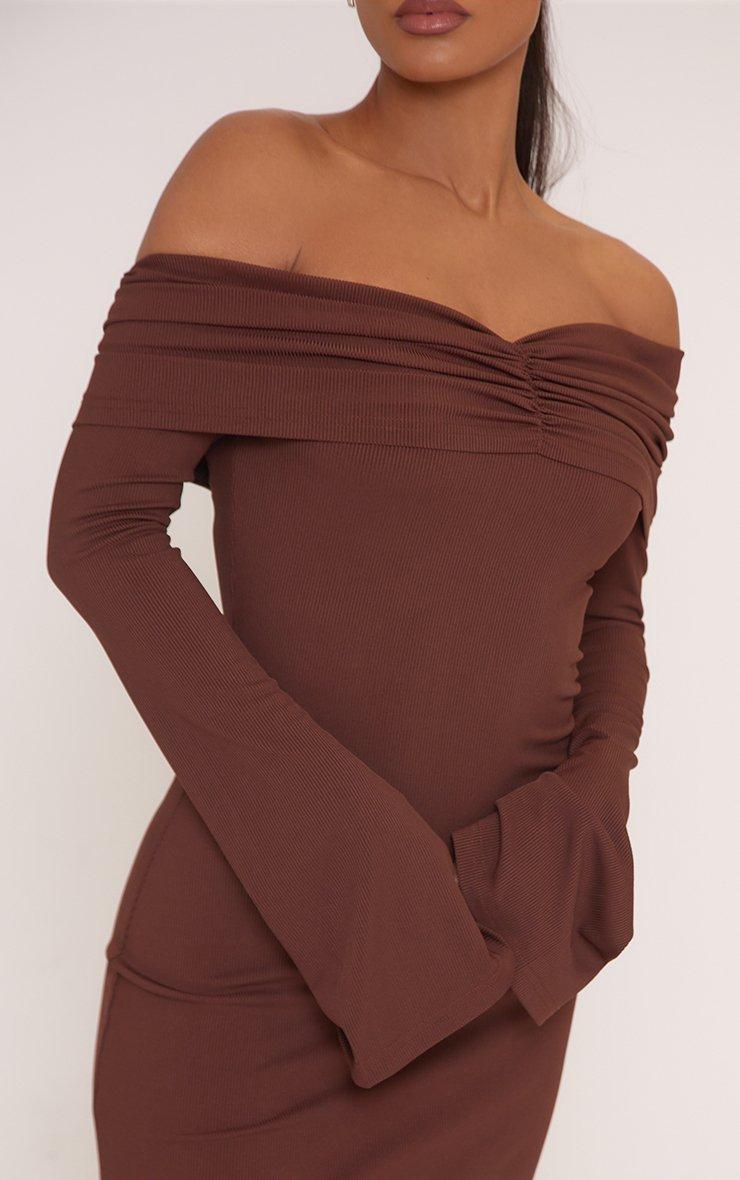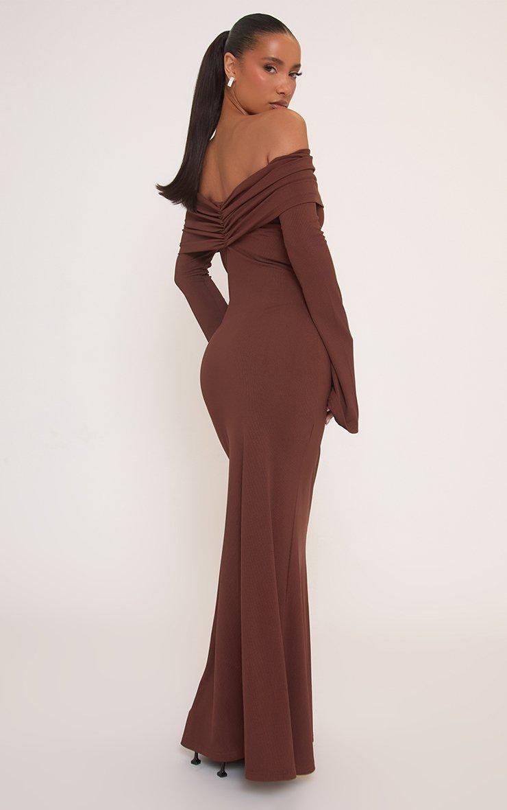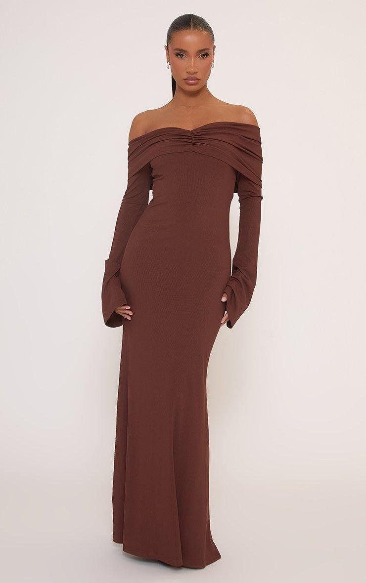 Long Flared Sleeve Bardot Ruched Maxi Dress In Brown