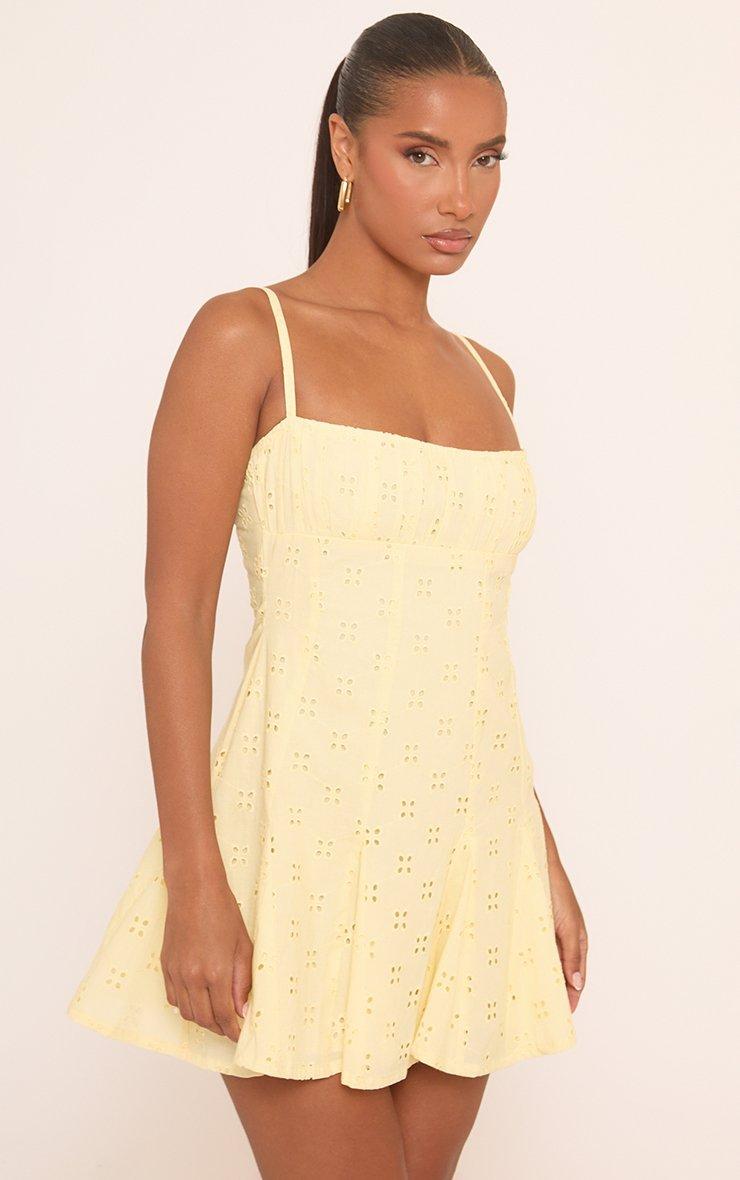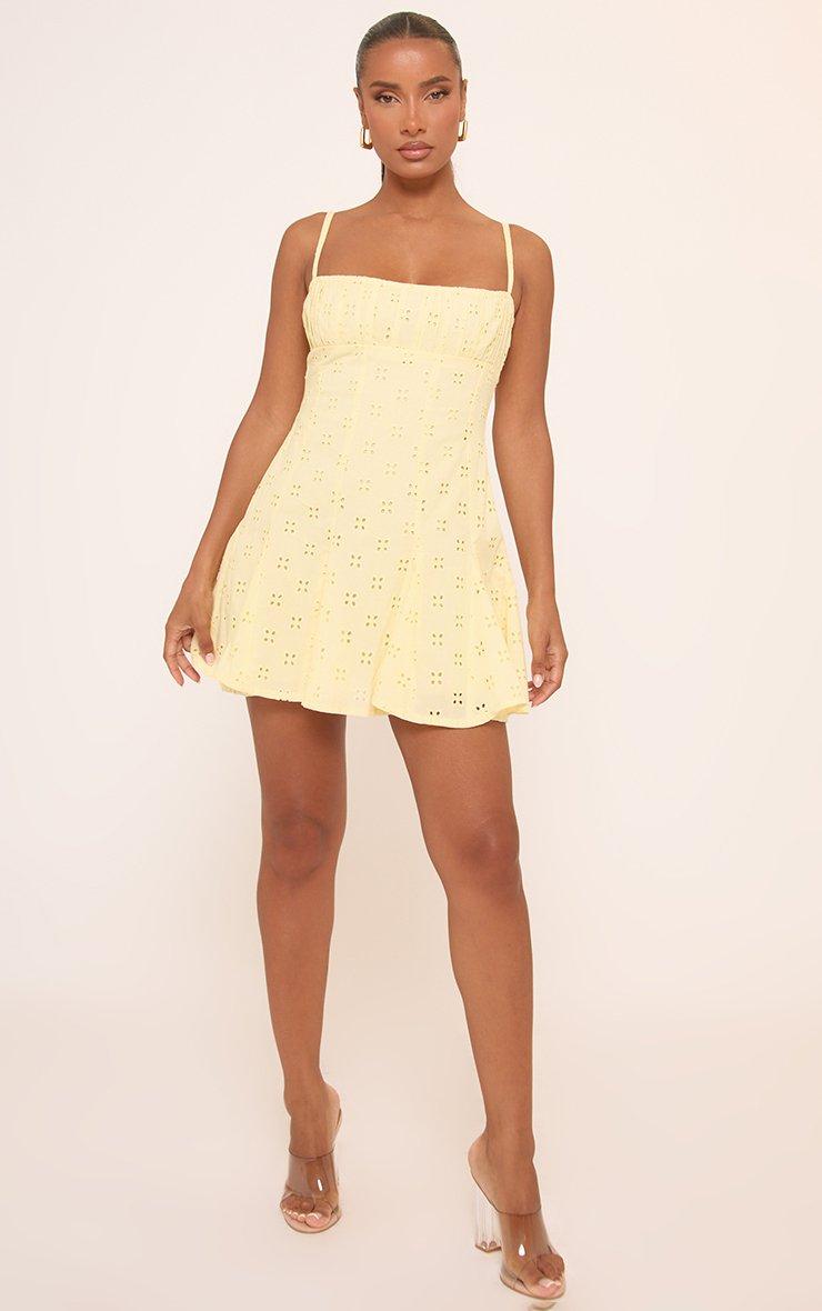 Square Neck Ruched Bust Detail Pleated Mini Dress In Yellow Broderie