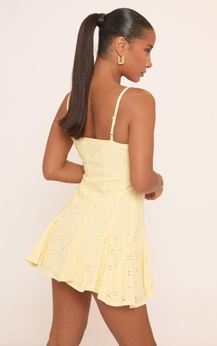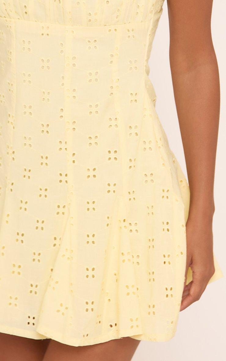 For those sunny days with a dash of elegance, doll. Featuring a yellow broderie material with square neck, ruched bust, and pleated mini design, this dress is giving you fresh, feminine vibes with a playful twist.