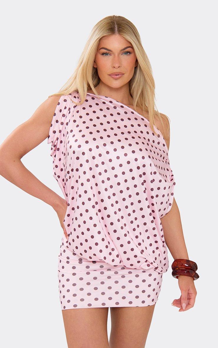 Step into the spotlight at your next summer event. Featuring baby pink polka dot slinky material with asymmetric draped detailing. Team with clear heels and a matching clutch for a look that is totally on-trend.