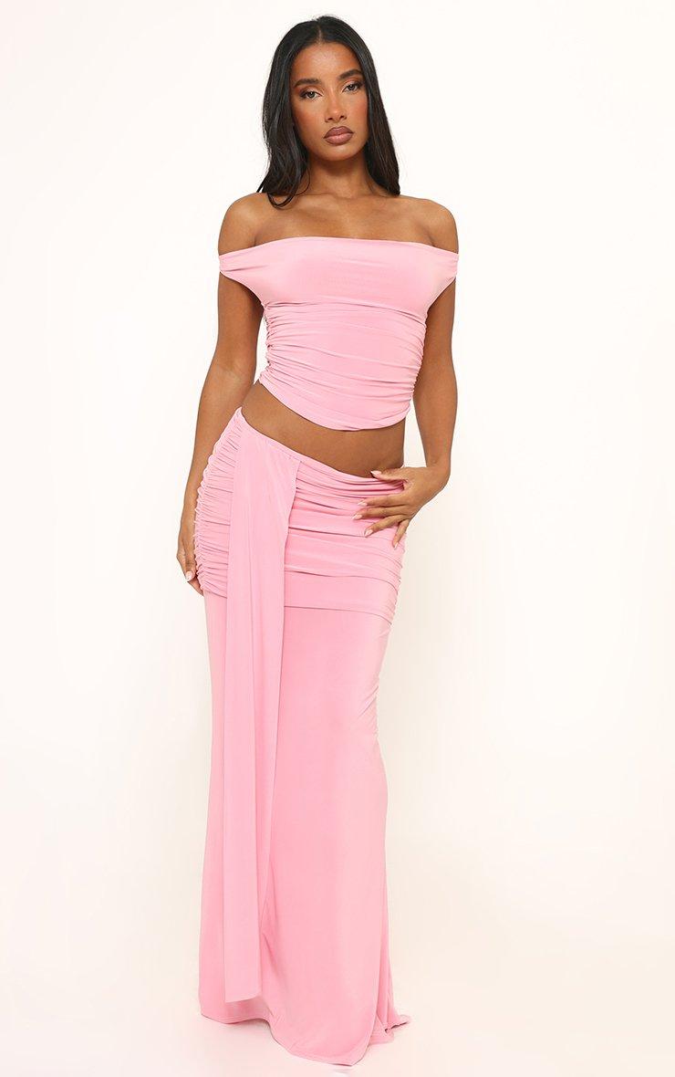 Date night ready, doll! Featuring a pink slinky fabric with off-the-shoulder design, open back, and ruched detailing, this top serves drama and allure with every twist and turn.