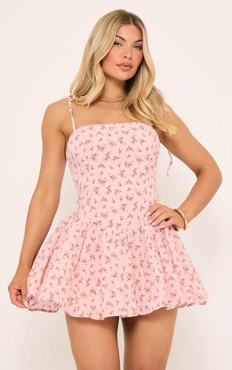 Picnic in the park? Yes, please! Featuring a pink floral print fabric with tie straps and a flippy hem, this square-neck mini dress is all about easy, breezy vibes with a dash of playful charm.