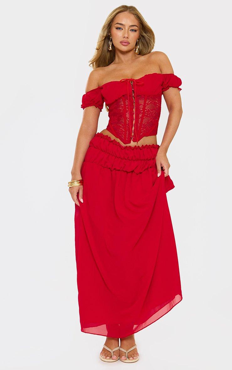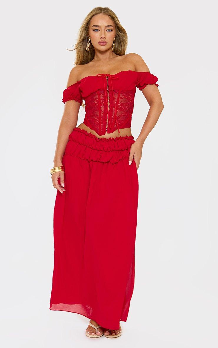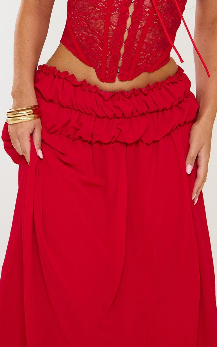 Turn up the drama, doll! Featuring bold red fabric with ruched waist and floaty detailing, this maxi skirt brings fierce, chic vibes perfect for standout moments with a touch of flair.