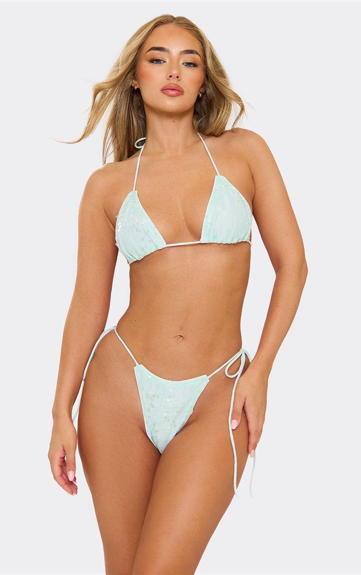Bring the sparkle, doll! Featuring blue sequin fabric, this triangle bikini set dazzles with tie side detailing for a bold, chic look that’s ready to shine all summer.