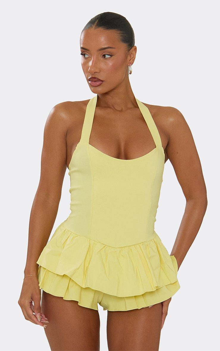 Halterneck Frill Hem Playsuit In Lemon