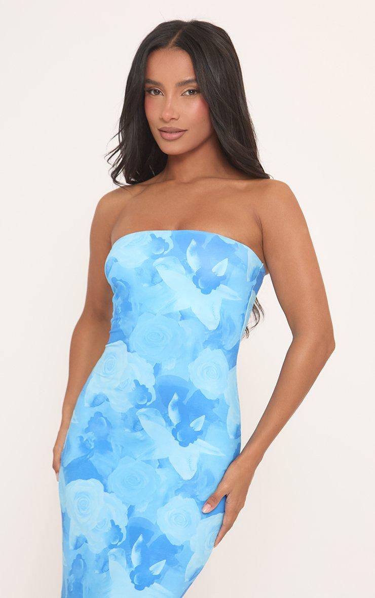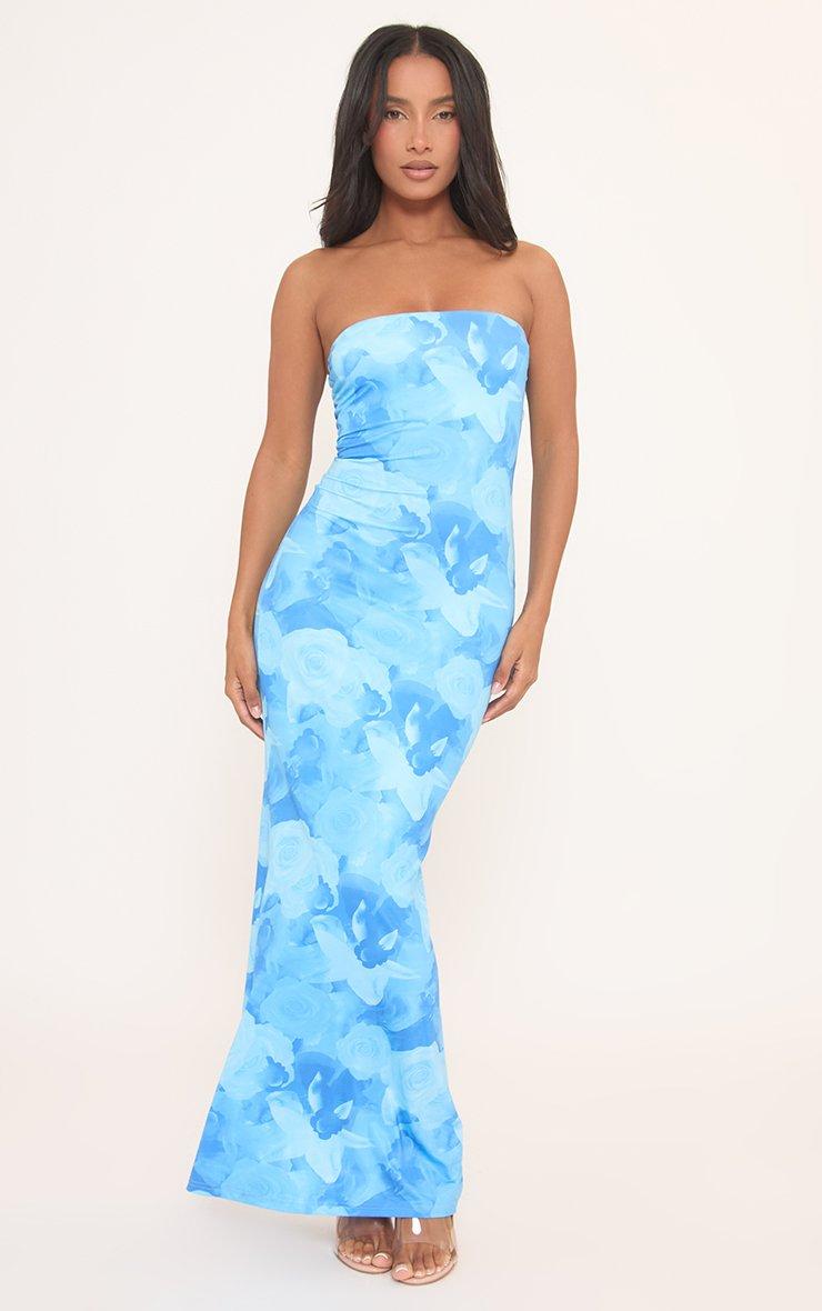 Time to shine, doll! Featuring a stunning blue floral print, this bandeau maxi dress is the perfect blend of elegance and effortless charm for any special occasion or evening out.
