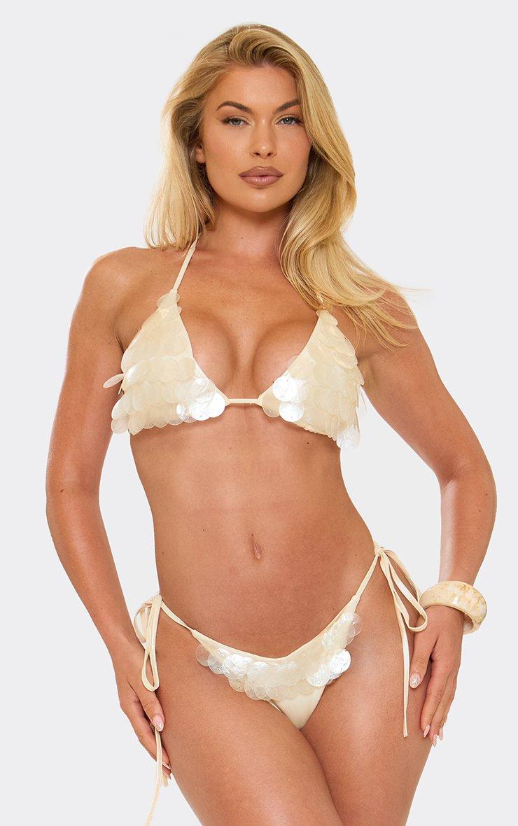 Triangle Tie Side Bikini Set In Cream Disc Sequin