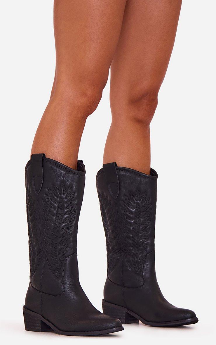 Merla Embroidered Detail Pointed Toe Mid Calf Western Cowboy Boot In Black Faux Leather