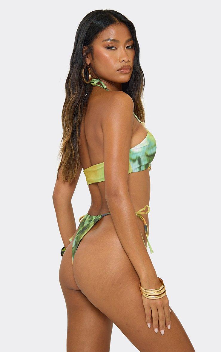 Halterneck Cross Strap Trim Detail Bikini Set In Green Abstract Print