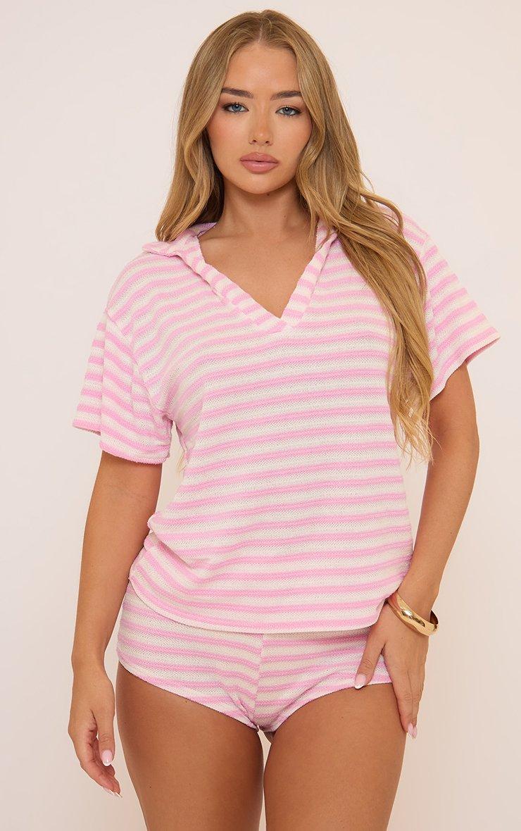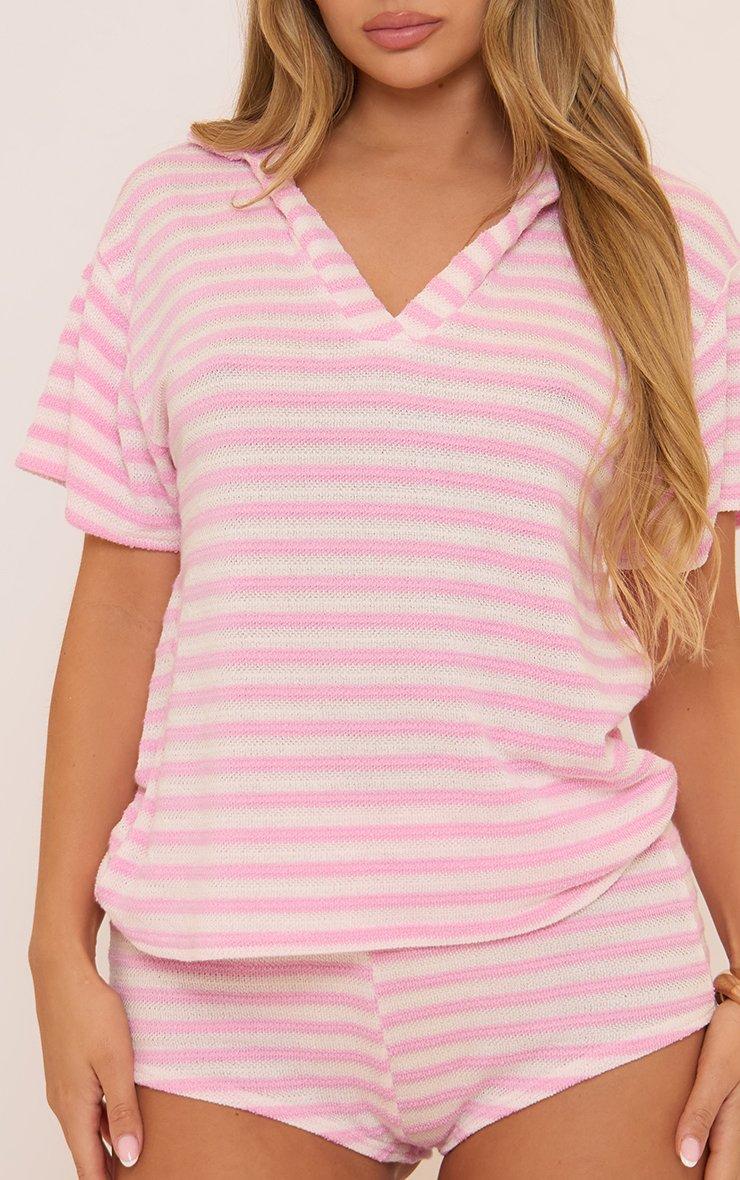 45810 Stripe Collar V Neck Top In Pink