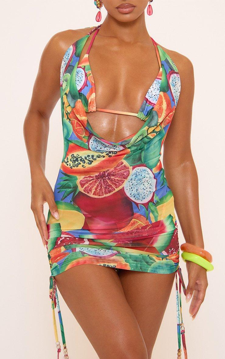 Cowl Neck Ruched Beach Mini Dress In Multi Fruit Print