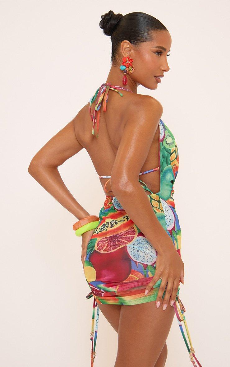 Hit refresh on your beachwear, doll! Featuring lightweight slinky material with ruched detailing, this multi fruit print mini dress brings vibrant vibes and chic energy for sun-soaked days.