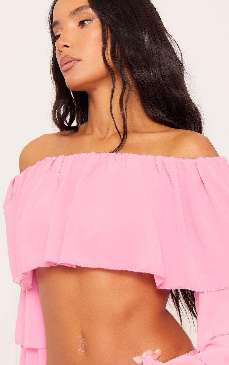 Long Sleeve Bardot Layered Frill Top And Drape Back Skirt Co-Ord Set In Pink