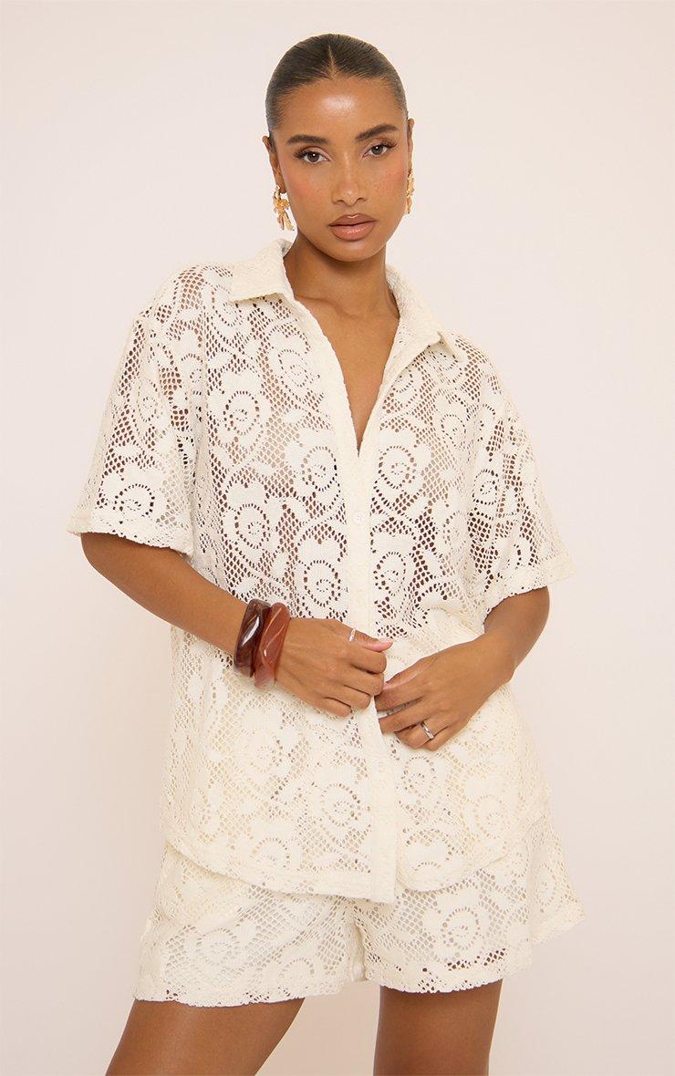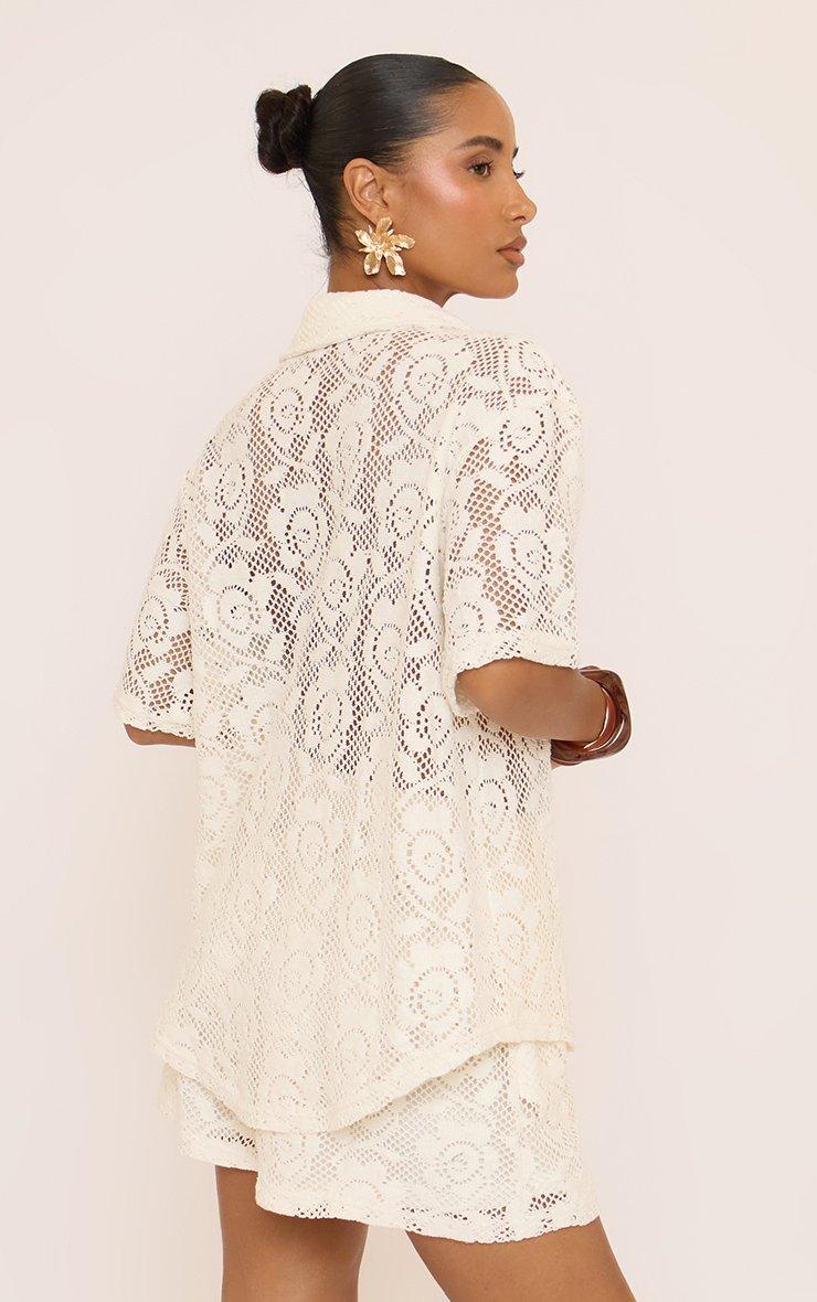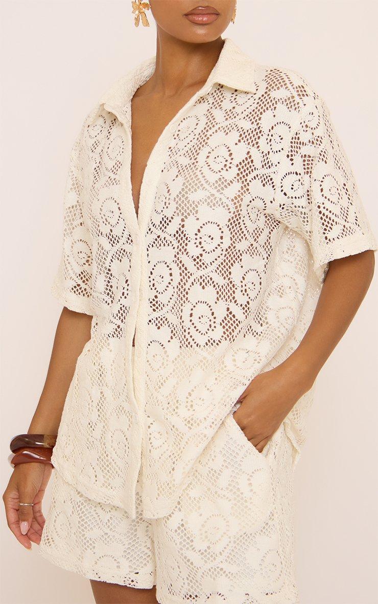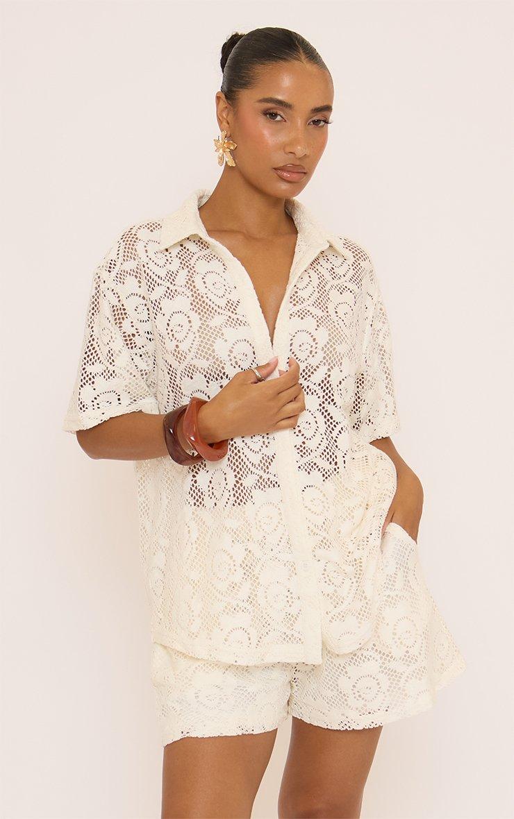 Short Sleeve Button Down Shirt In Cream Crochet Lace