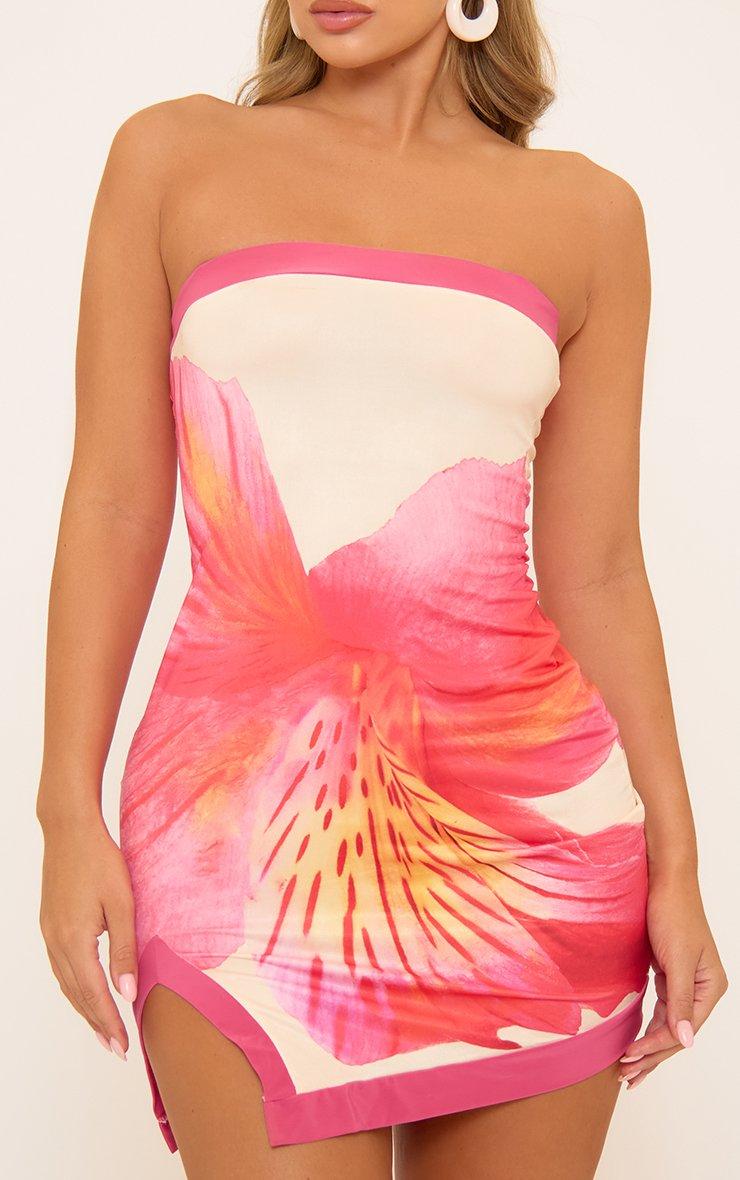 Turn heads in this pink floral print mini dress, featuring smooth fabric with bandeau silhouette and bold contrast panel detailing. Perfect for dolls who serve fresh, chic vibes with a flirty edge.