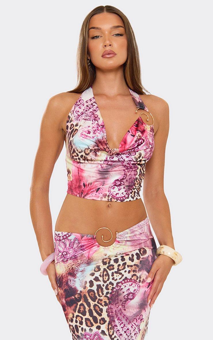 Serve fresh vibes, doll! Featuring soft pink printed fabric, this crop top dazzles with cowl neck and trim detailing for a bold, chic finish packed with attitude.