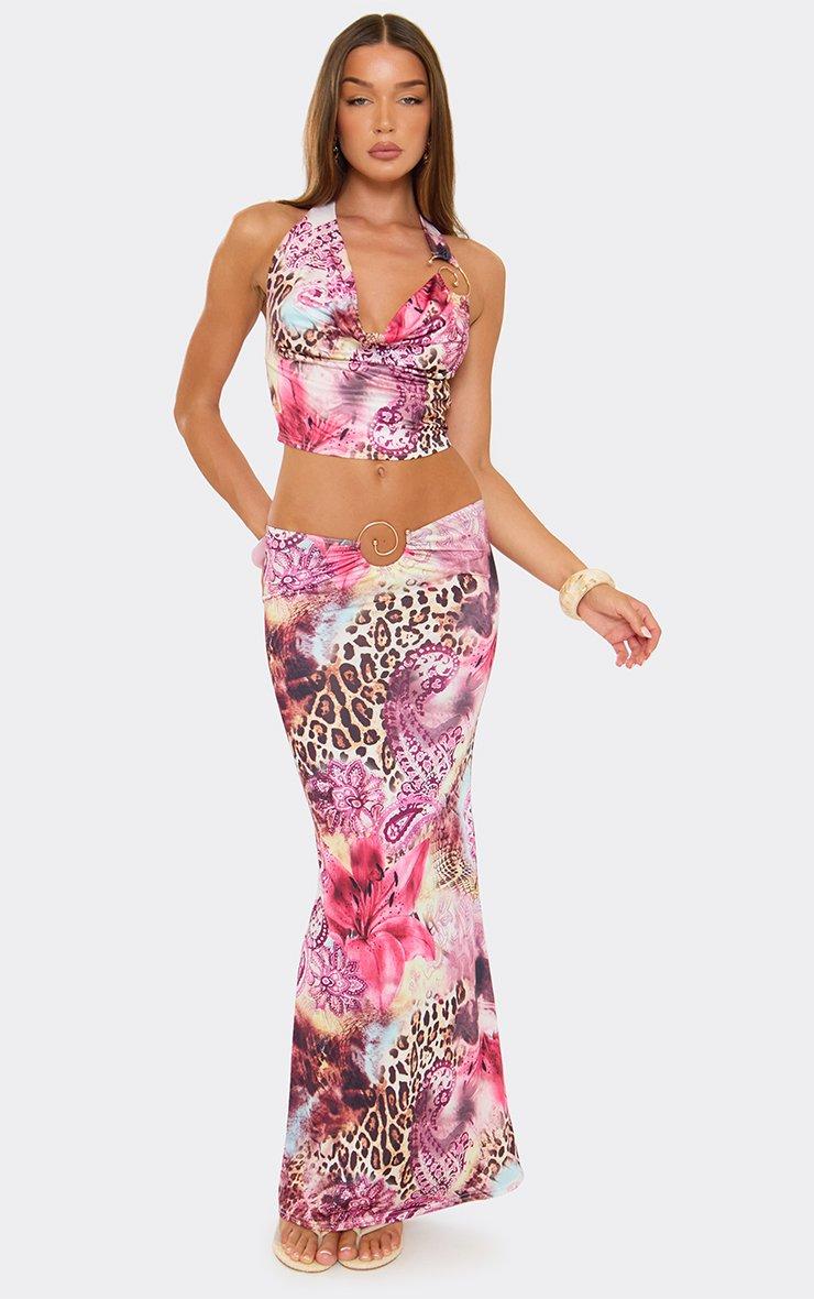 Cowl Neck Trim Detail Crop Top In Pink Printed