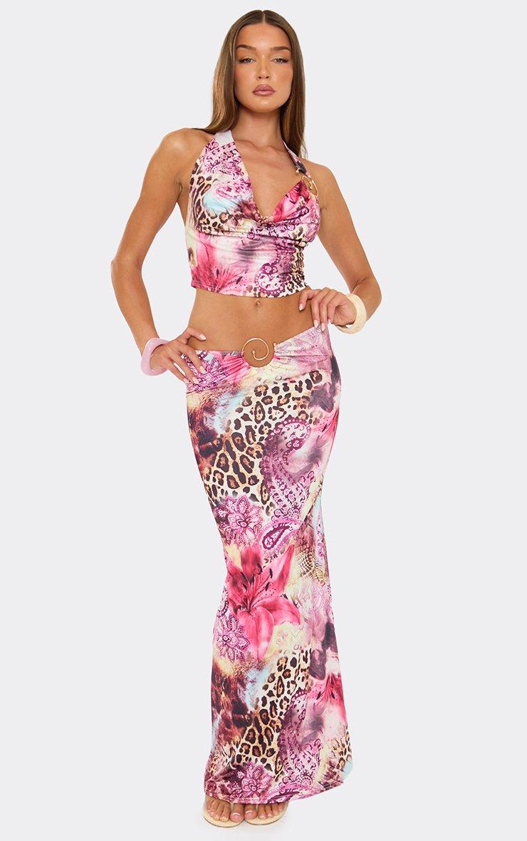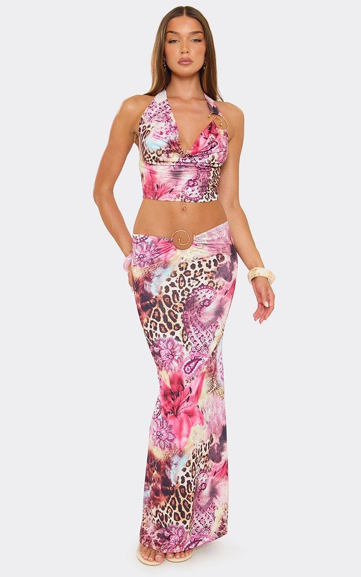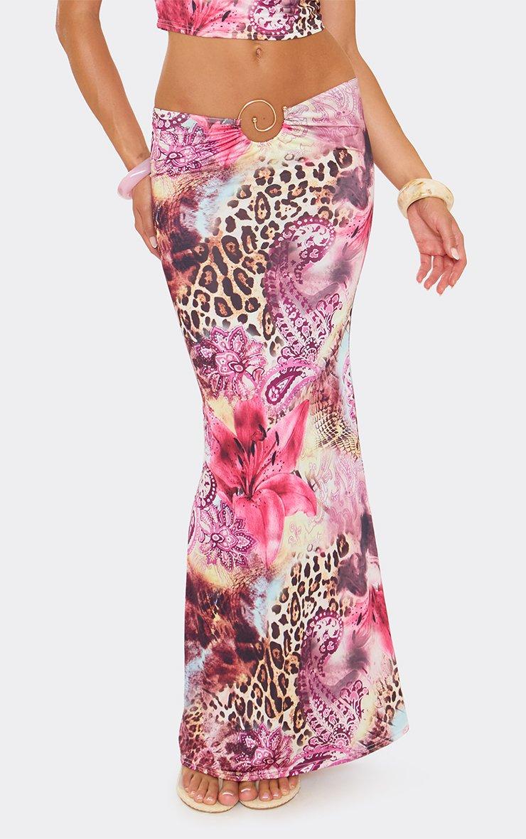 Mid Rise Trim Detail Maxi Dress In Pink Printed