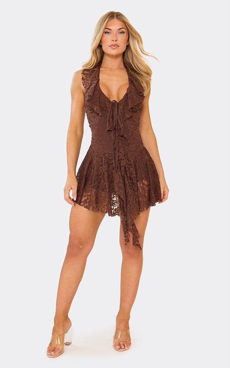 Plunge Neck Tie Front Frill Trim Detail Mini Dress In Chocolate Brown Lace