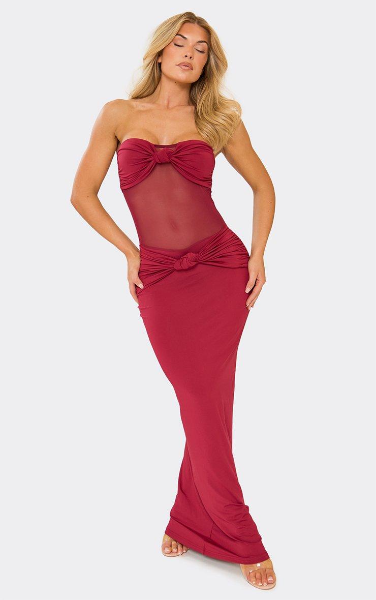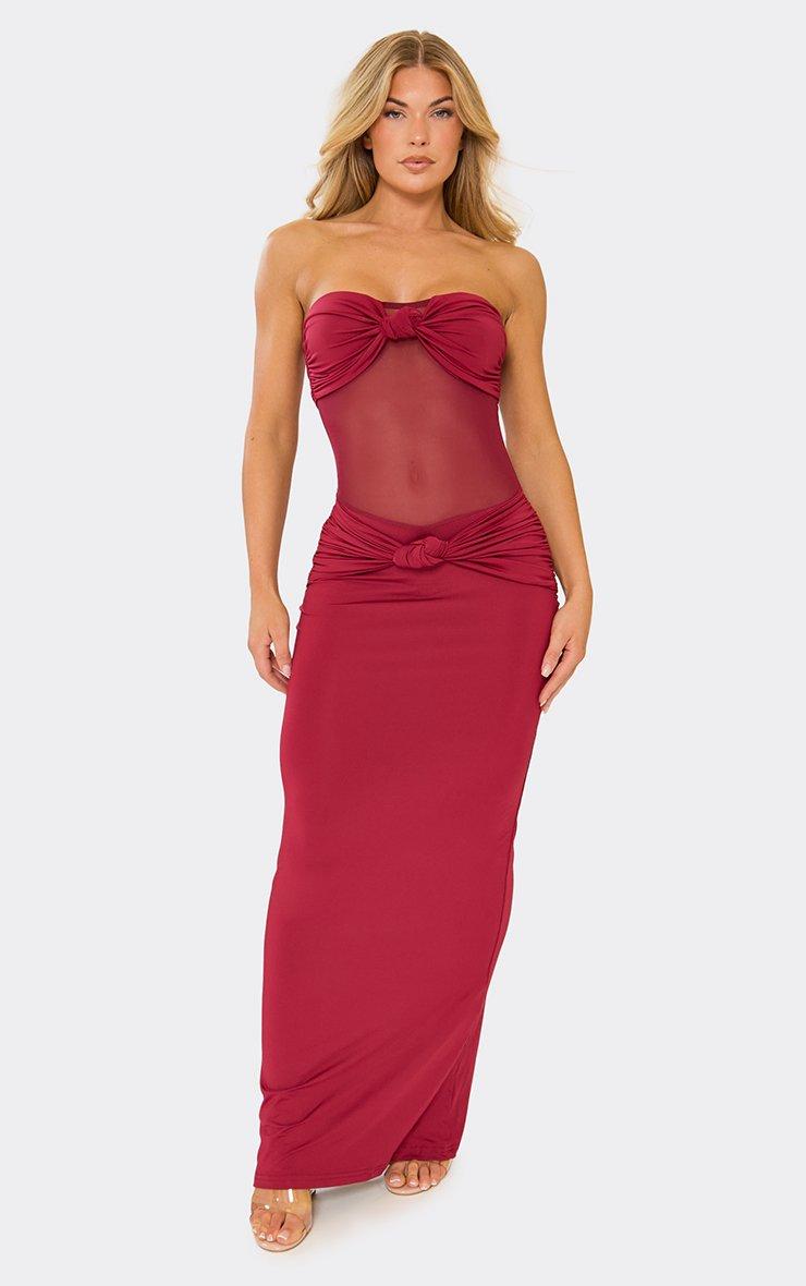 Bandeau Sheer Panel Knot Front Detail Maxi Dress In Burgundy