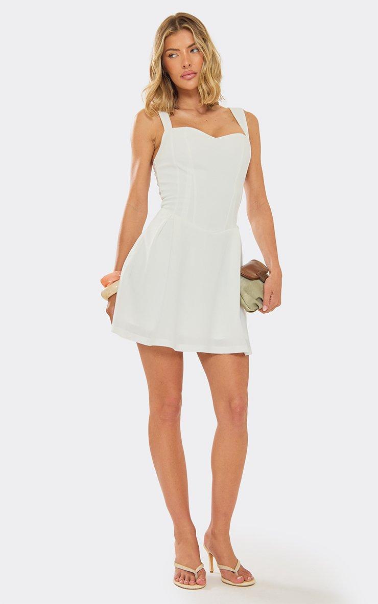 Date night calling, doll. Featuring a white material with pleated detailing and a sweetheart dropped waist, this mini dress is giving bold, chic vibes for playful nights out.