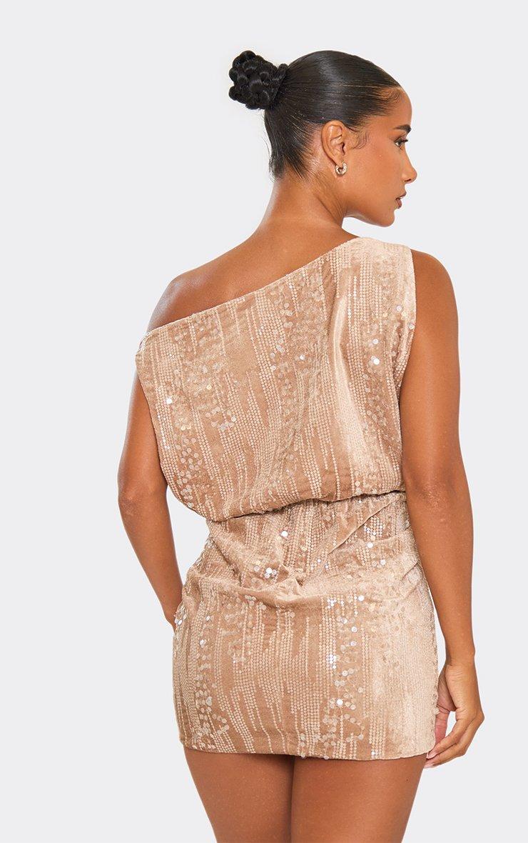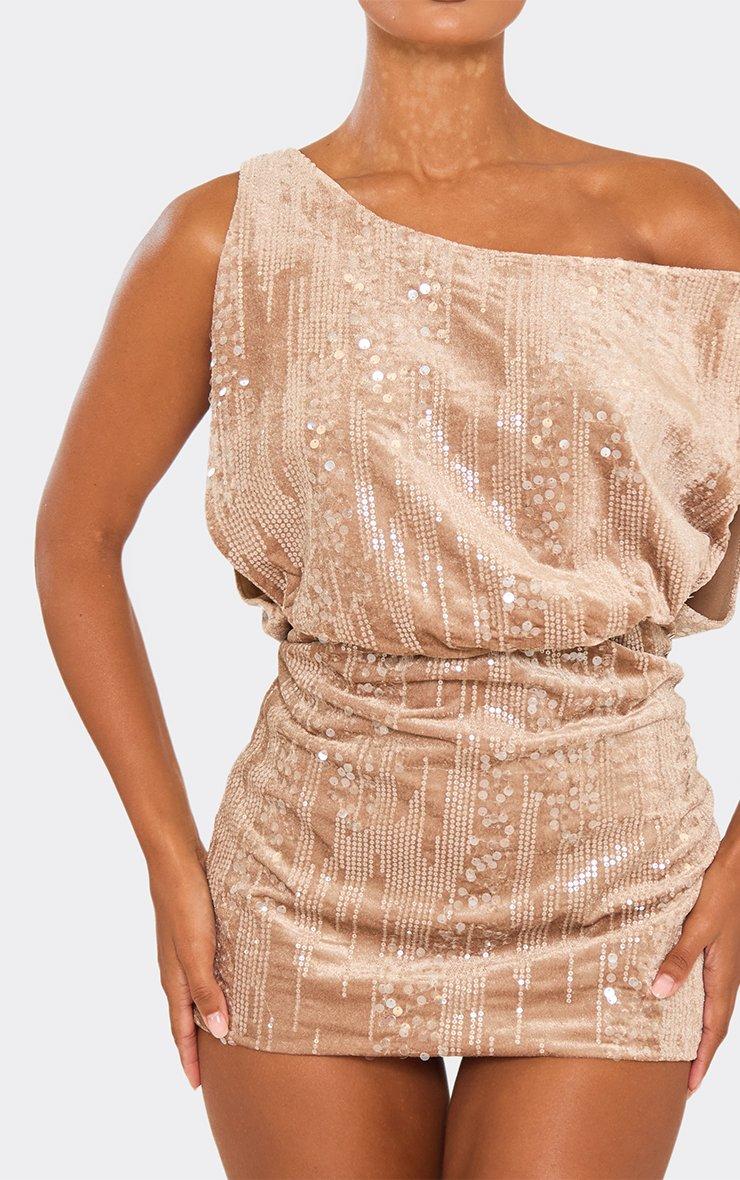 One Shoulder Drape Detail Mini Dress In Beige Sequin Velour