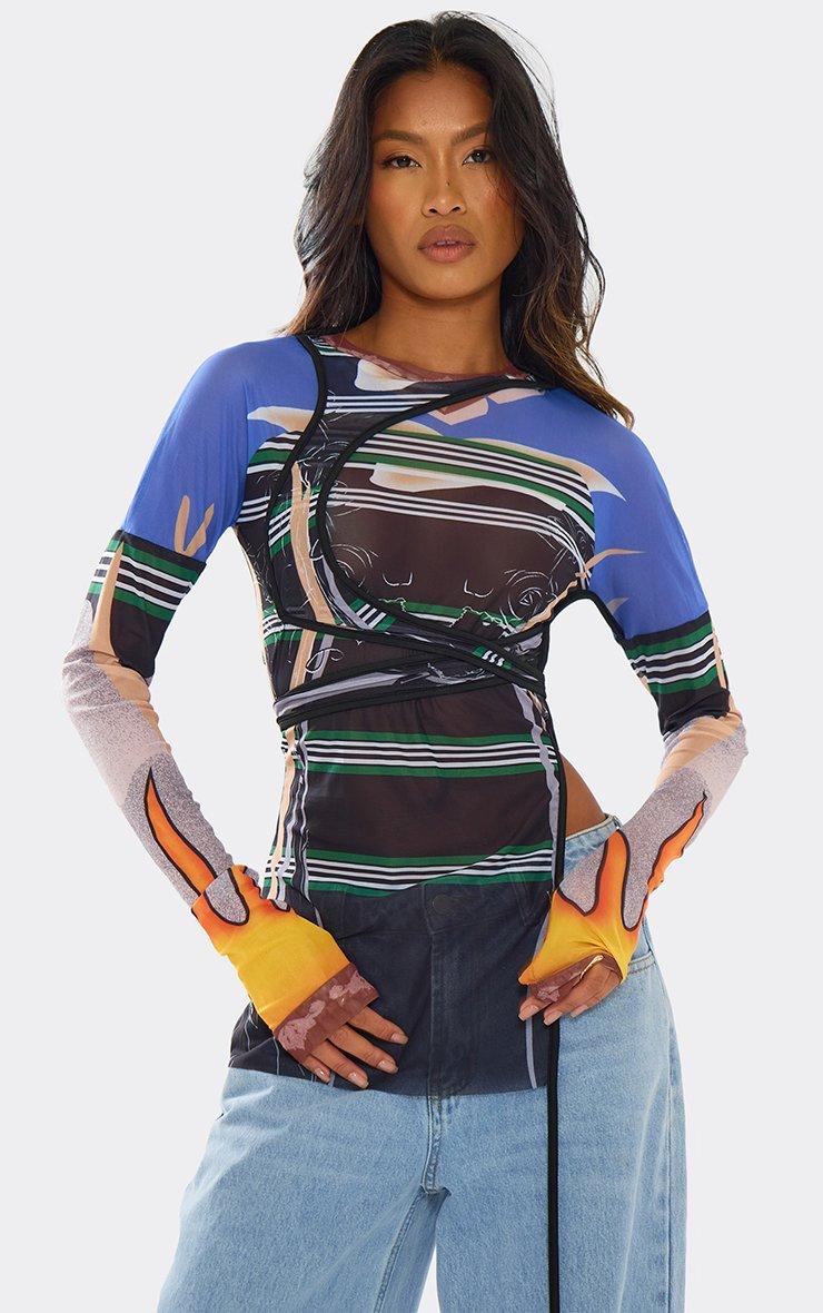 Long Sleeve Side Split Detail Top In Multi Abstract Print Mesh