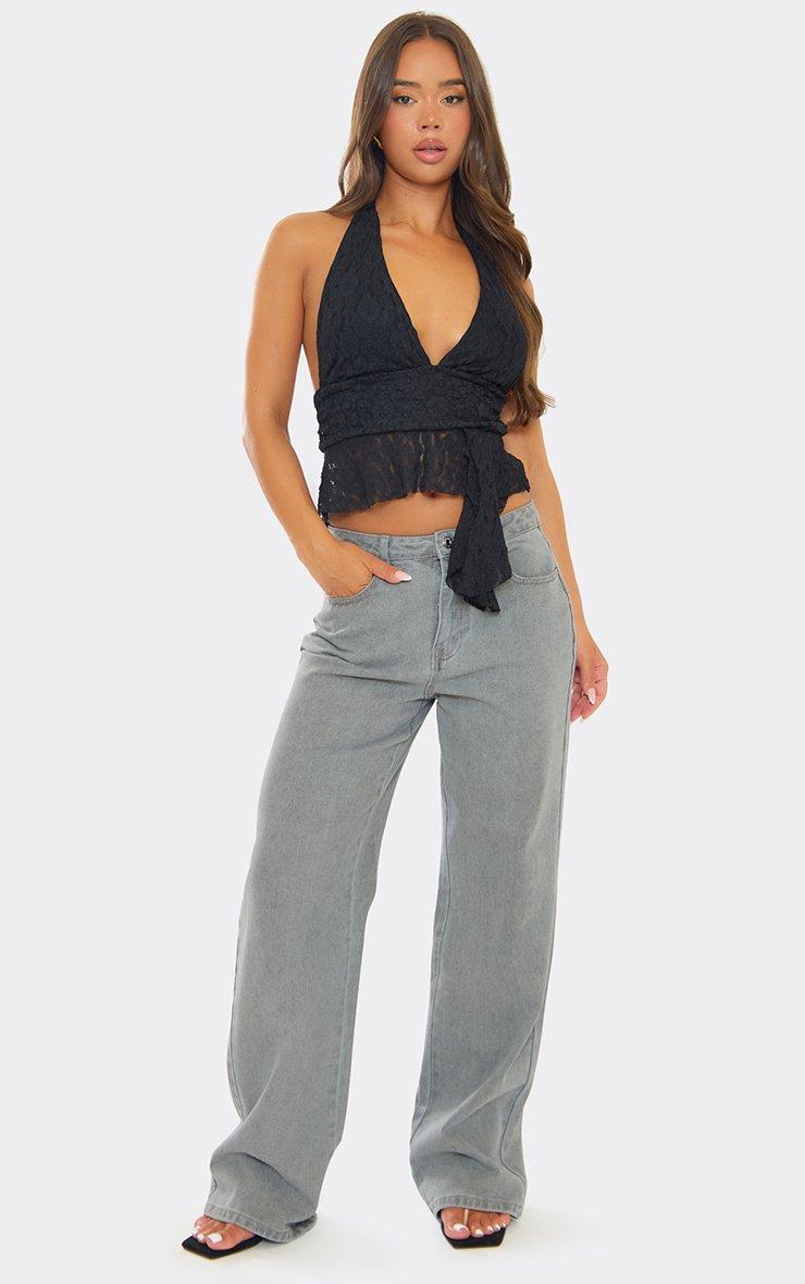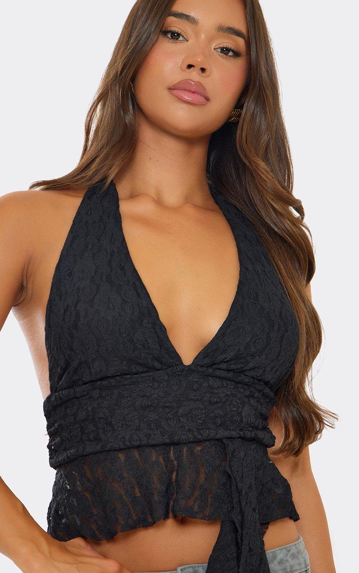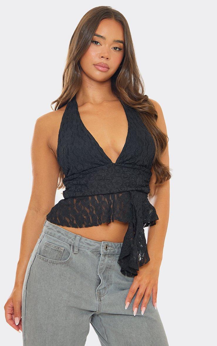 Black lace with a halterneck cut and frill hem drape detailing—this top brings drama and elegance in one chic moment. Serve sheer attitude from day to after-dark, doll.
