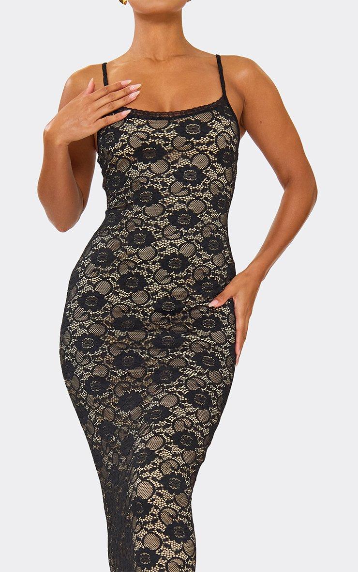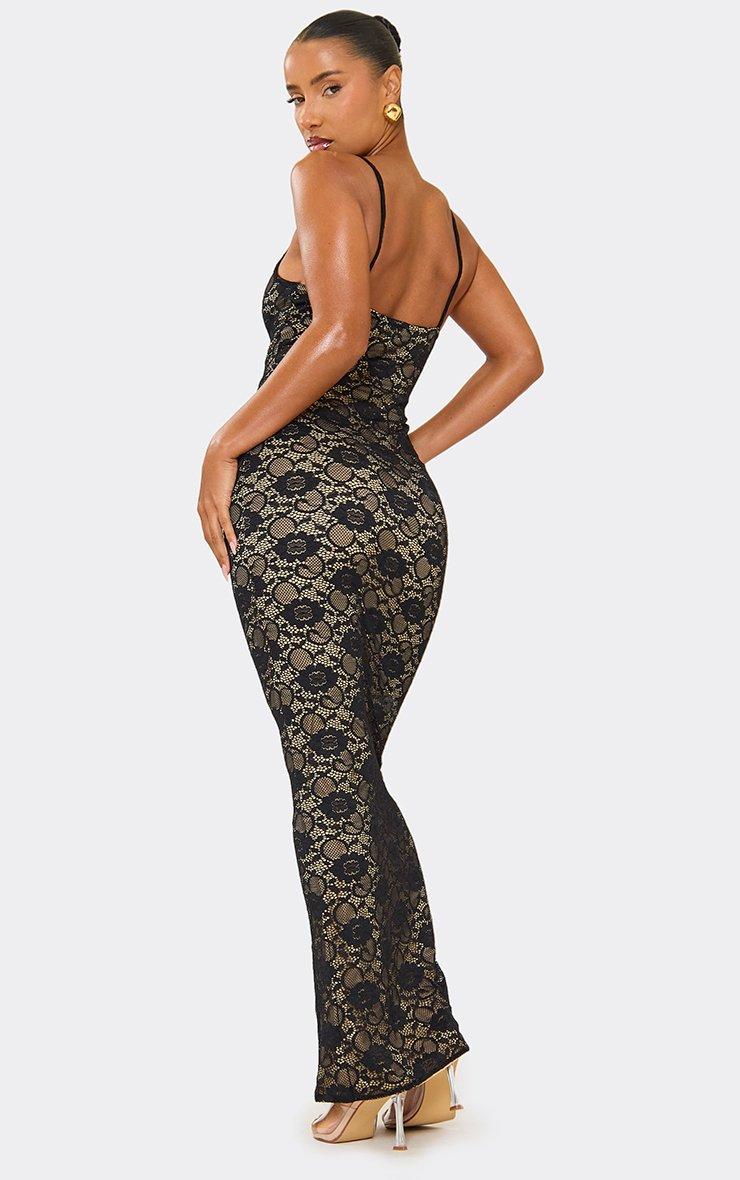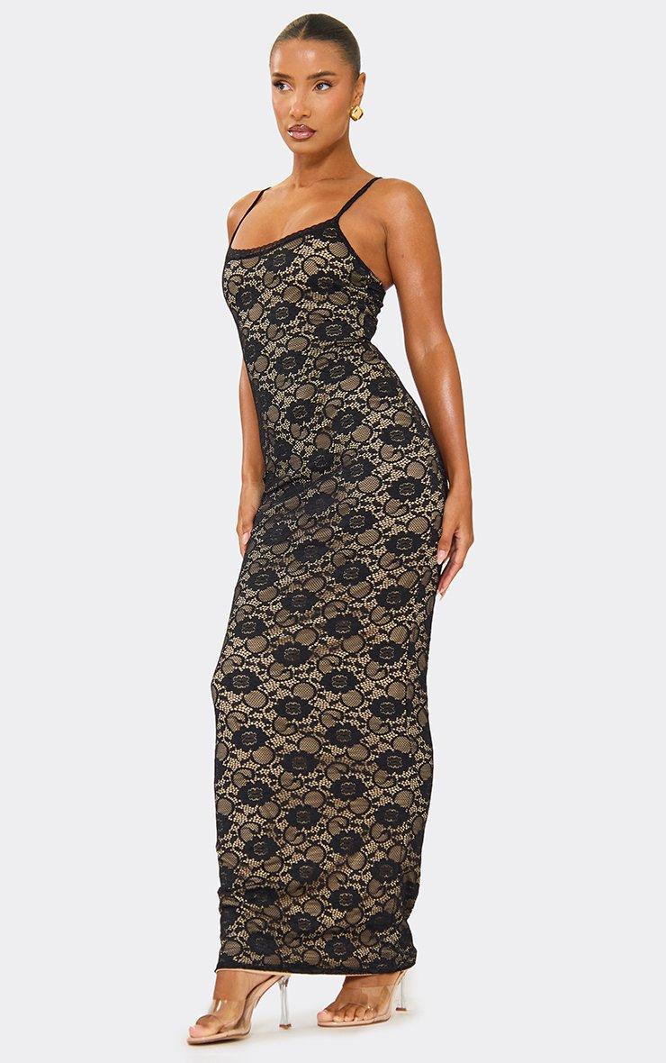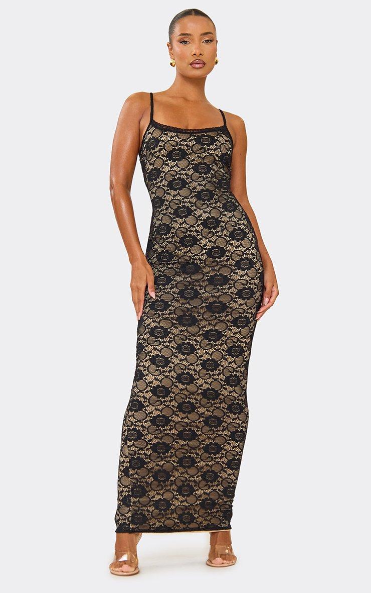 Say hello to your showâstopper for the night - the black and white lace maxi dress. Think sleek spaghetti straps, a flattering scoop neckline, and soft black lace that's layered over a nude underlay for maximum impact. This floorâskimming maxi dress hugs in all the right places (bodycon fit alert) while giving you mainâcharacterâ¯vibes for date night outfit ideas, glam evenings out, or any moment where you're the outfit. Style this black and white lace maxi dress with strappy heels and eye catching jewellery - you're set to steal the spotlight. Key Features Black Colour Lace Overlay & Nude Underlay Spaghetti Straps Scoop Neckline Bodycon Fit Maxi Length