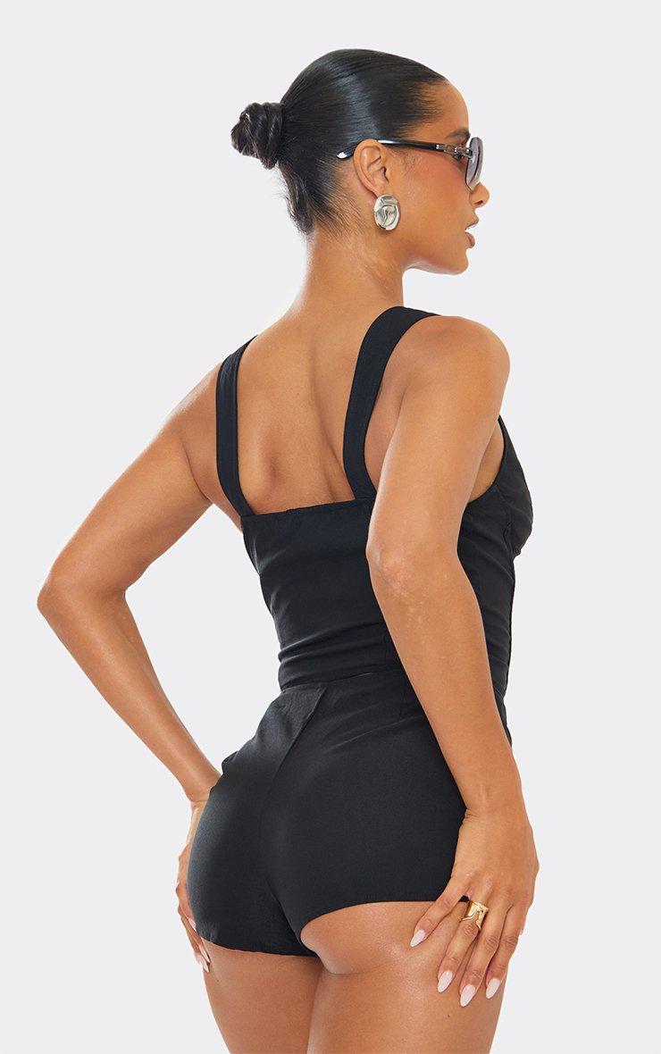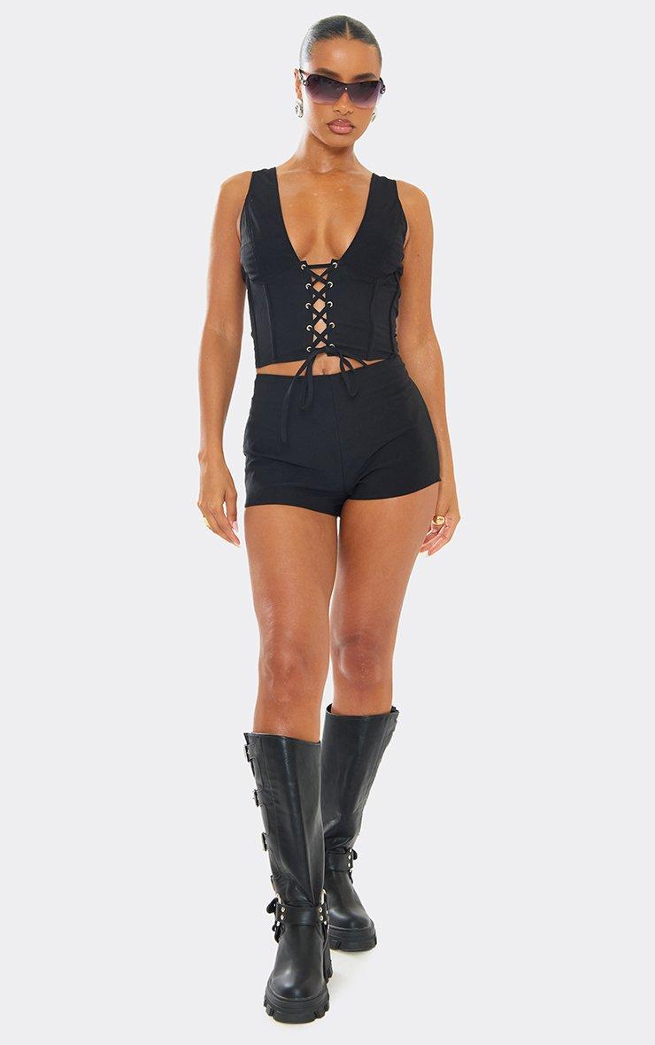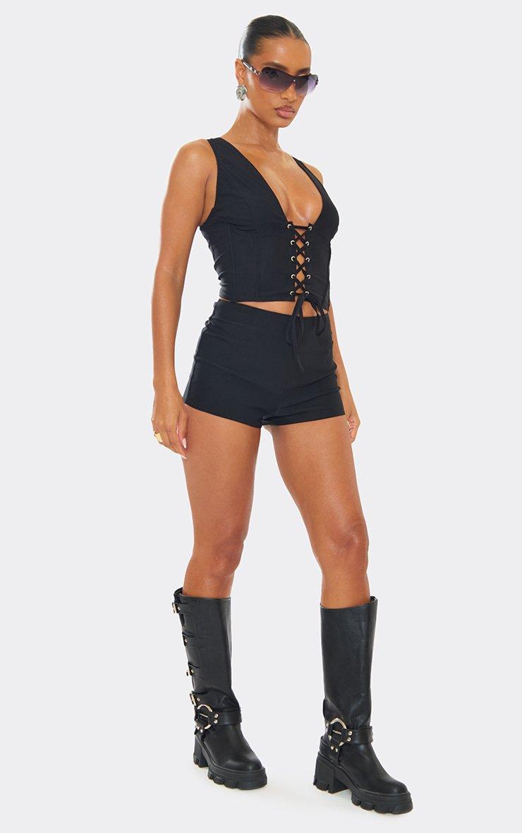 Weekend vibes, doll. Featuring a black stretch woven material with sleek detailing and a low rise fit, these booty shorts are serving bold, playful energy for nights out.