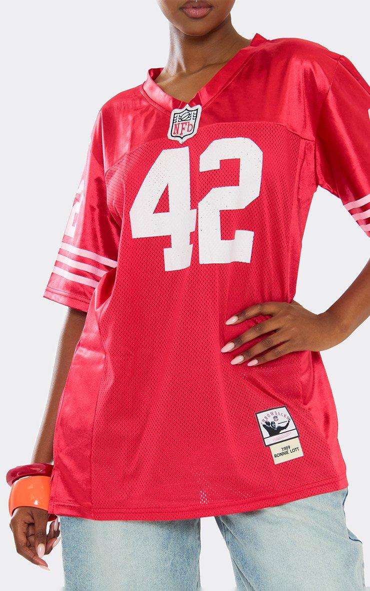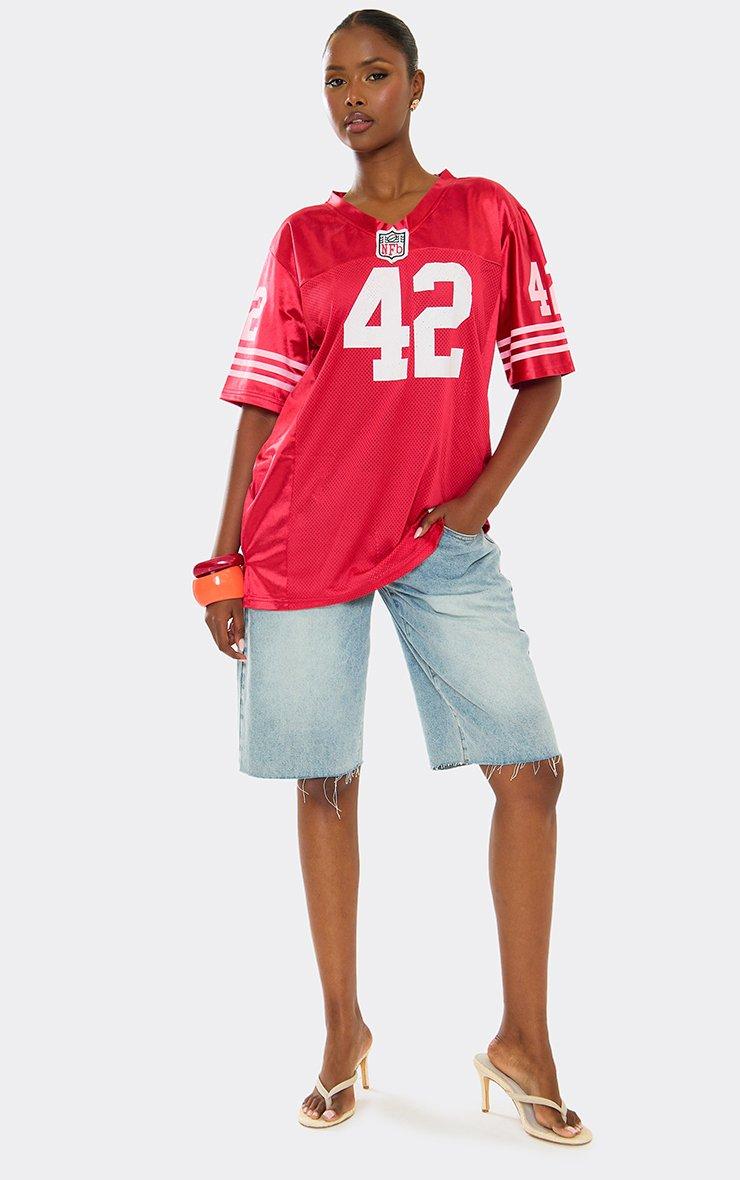 Casual cool, doll, featuring a red cotton blend material with short sleeve and contrast printed varsity detailing, this football top brings sporty, playful energy to your look.