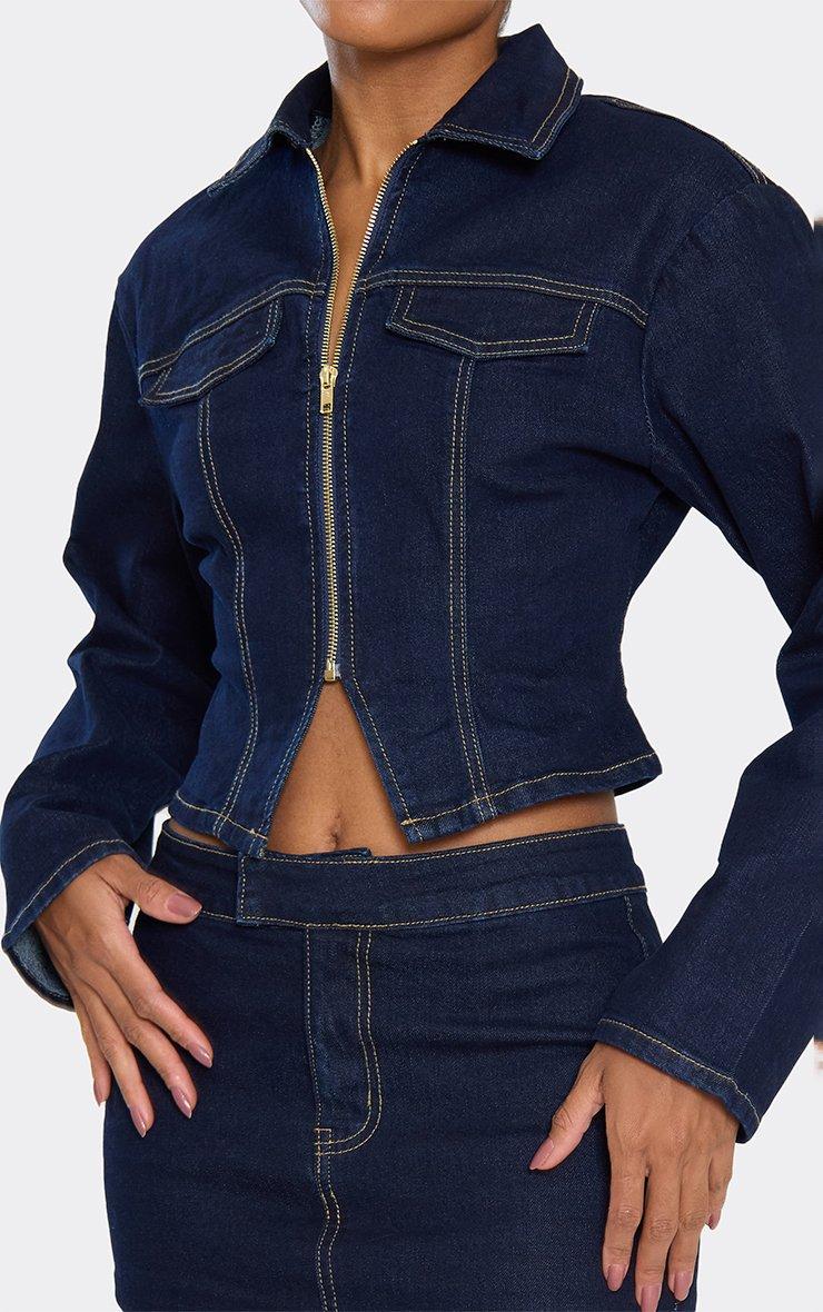 Long Sleeve Zip Up Front Cinched Waist Fitted Top In Indigo Denim