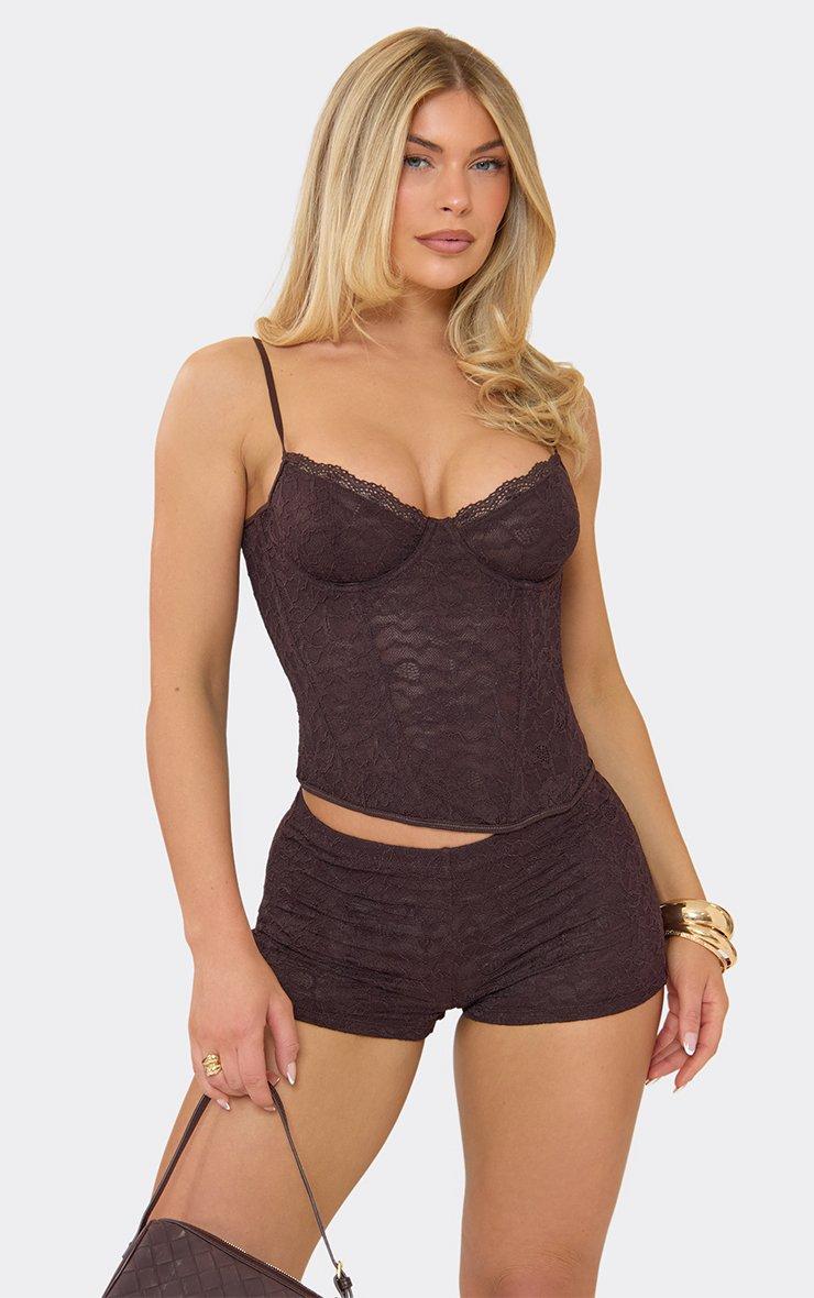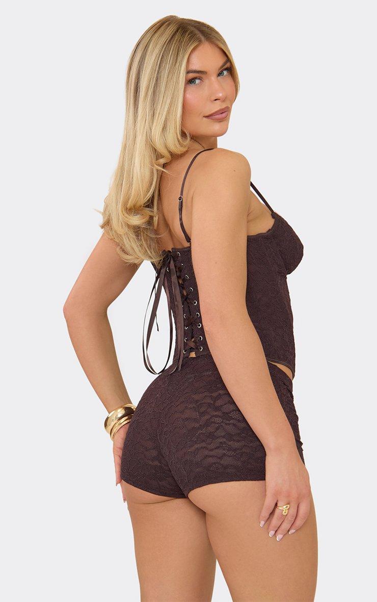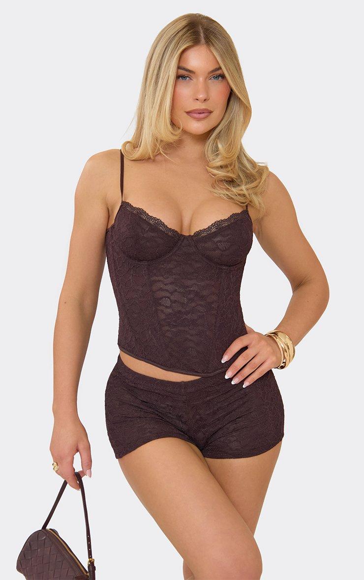Night-out plans call for statement tops with boss energy. Featuring chocolate brown lace material with strappy design, lace-up back and corset detailing. Chic and bold—style with low rise jeans or a mini skirt and heels, doll.