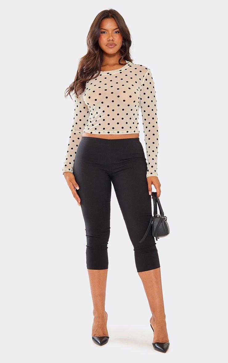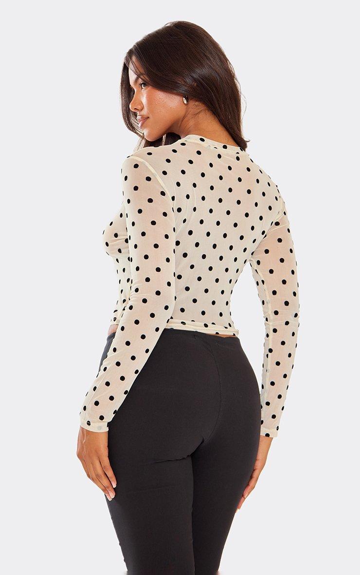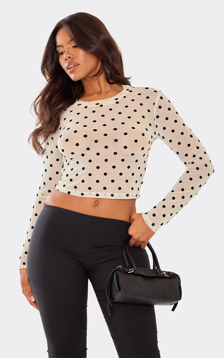 Long Sleeve Crew Neck Top In Cream Polka Dot Mesh