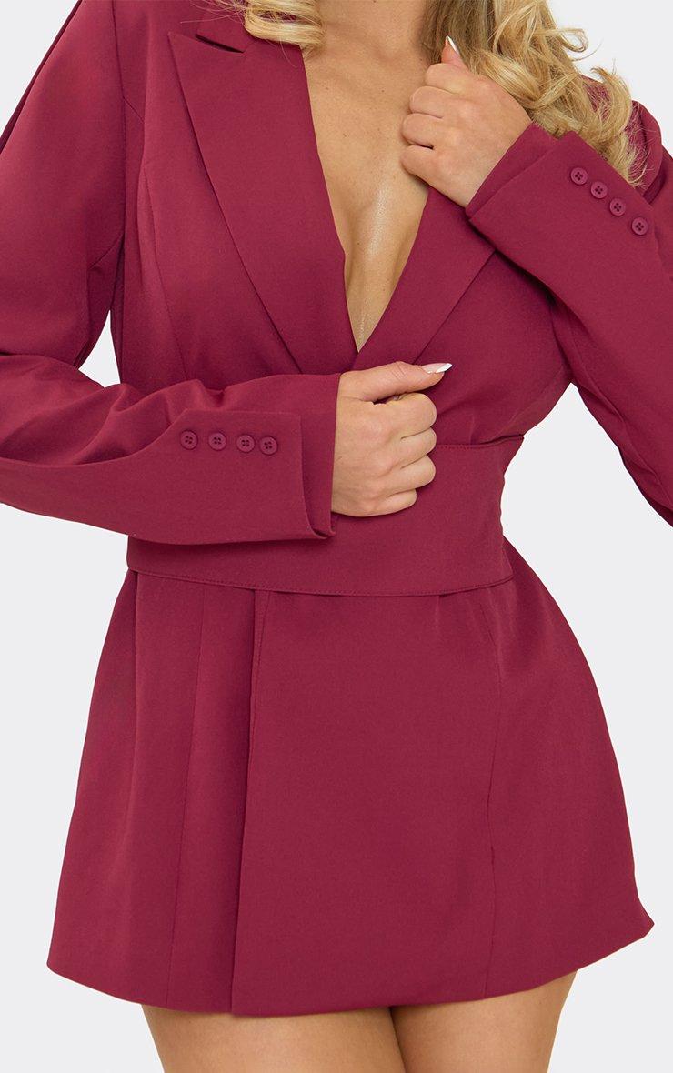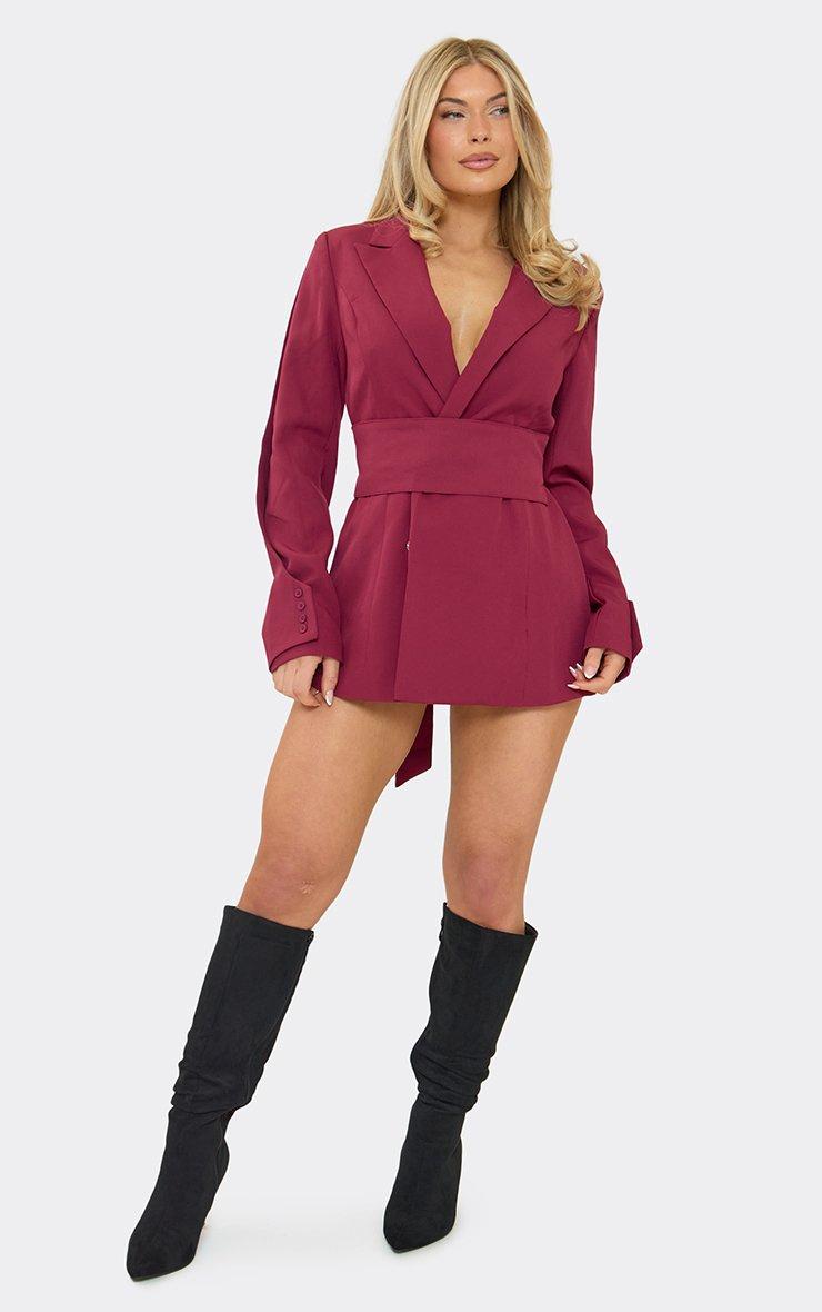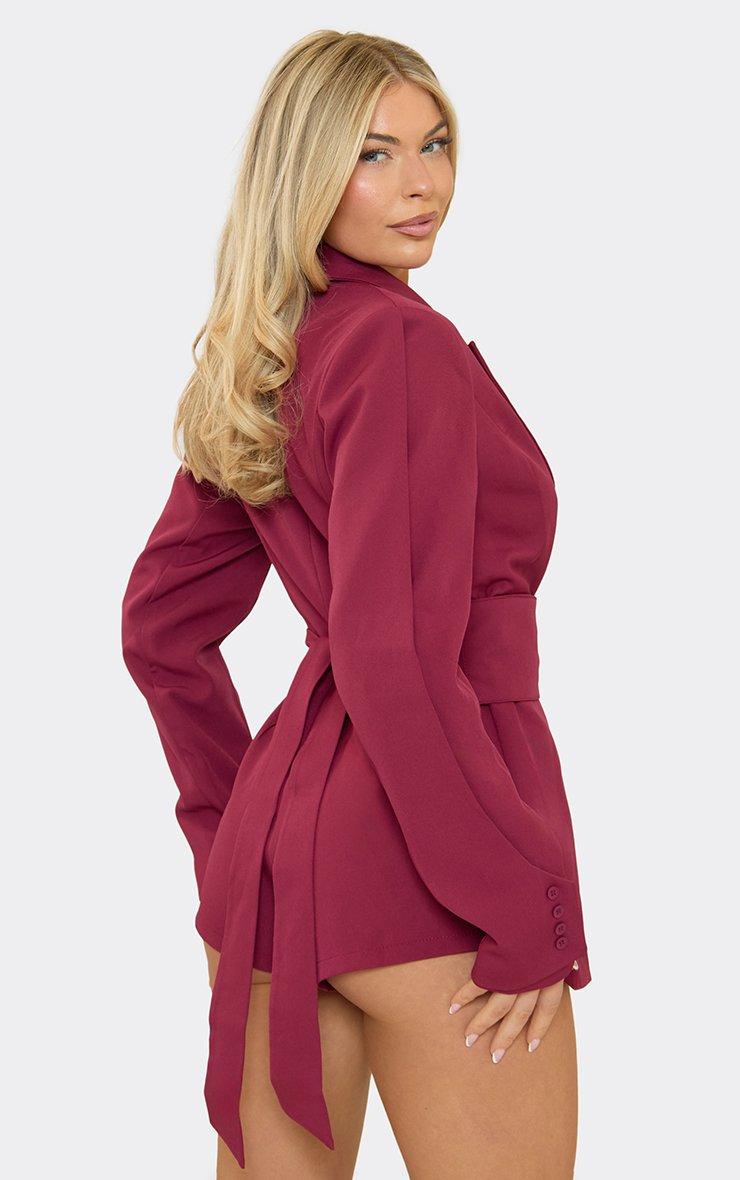 Long Sleeve Collared Cinched Waist Detail Blazer Playsuit In Burgundy