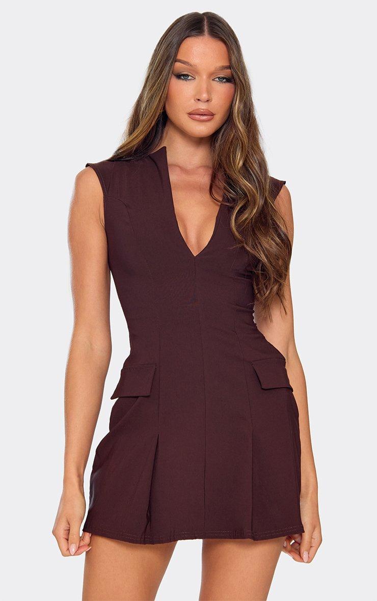 Plunge Pocket Pleat Detail A Line Mini Dress In Chocolate Brown Bengaline