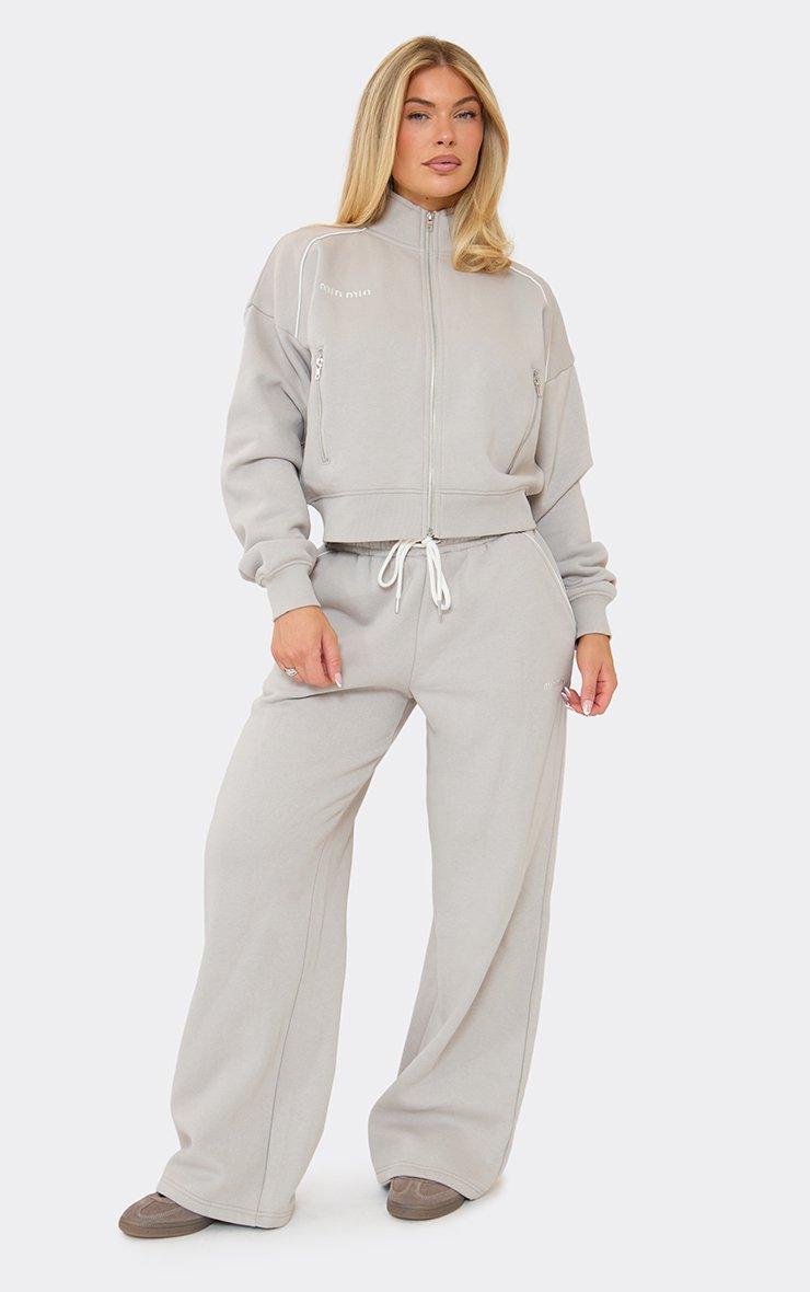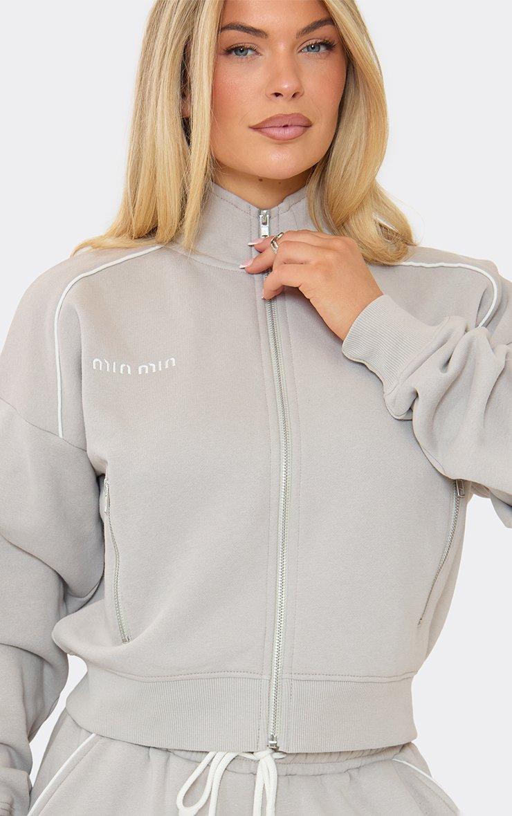 Perfect for off-duty days or street-style vibes, grey brushed fabric with contrast piping, ‘Min Min’ embroidered graphic, and zip-up detailing for a relaxed, on-trend finish. Layer over joggers or jeans with trainers for effortless it-girl energy.