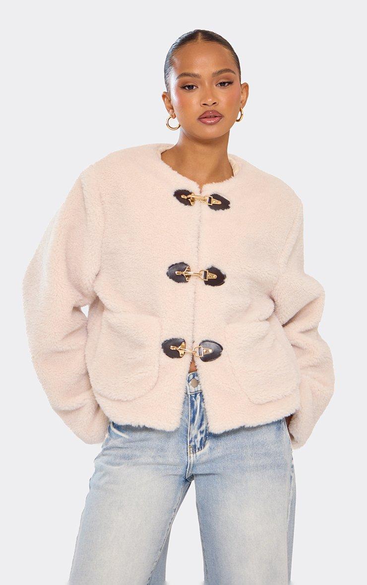 Long Sleeve Buckle Front Detail Jacket In Cream Borg