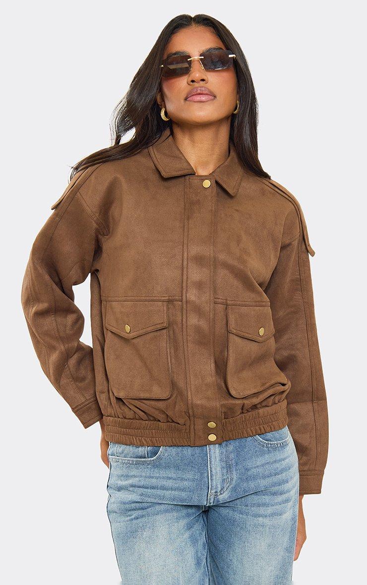Long Sleeve Pocket Detail Bomber Jacket In Brown Faux Suede