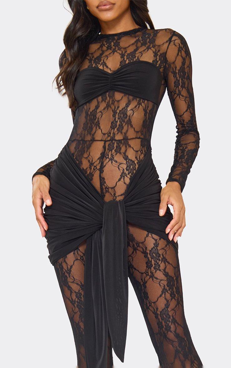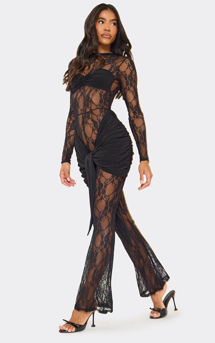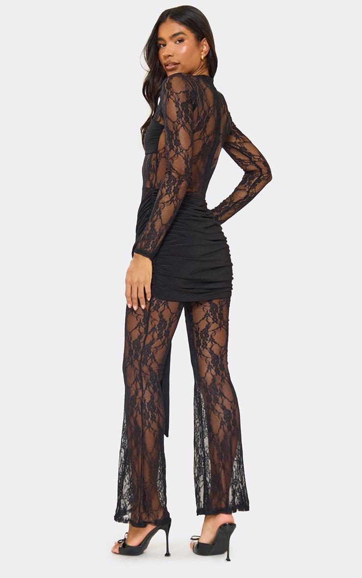 Long Sleeve Contrast Ruched Drape Front Detail Flare Leg Jumpsuit In Black Lace