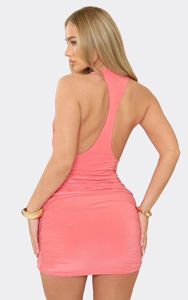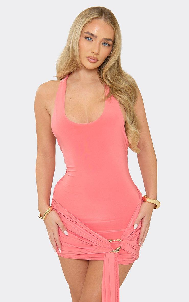 Sleeveless Low Racer Back Drape Trim Mini Dress In Coral Slinky