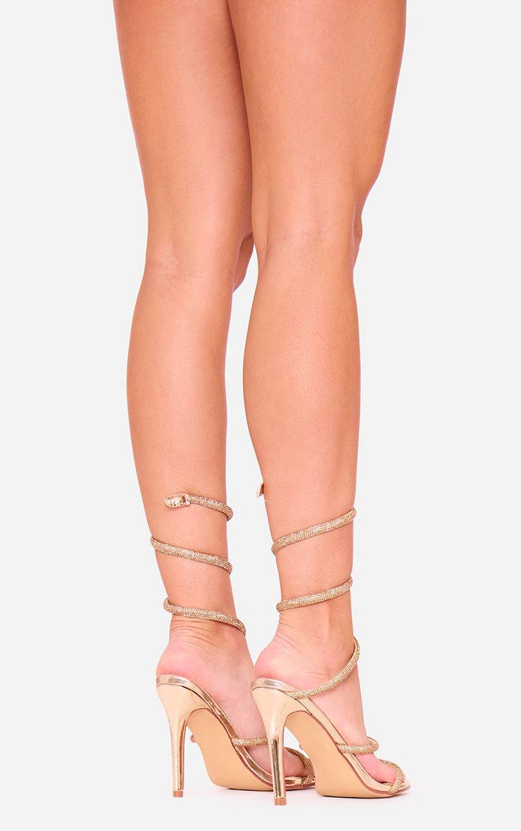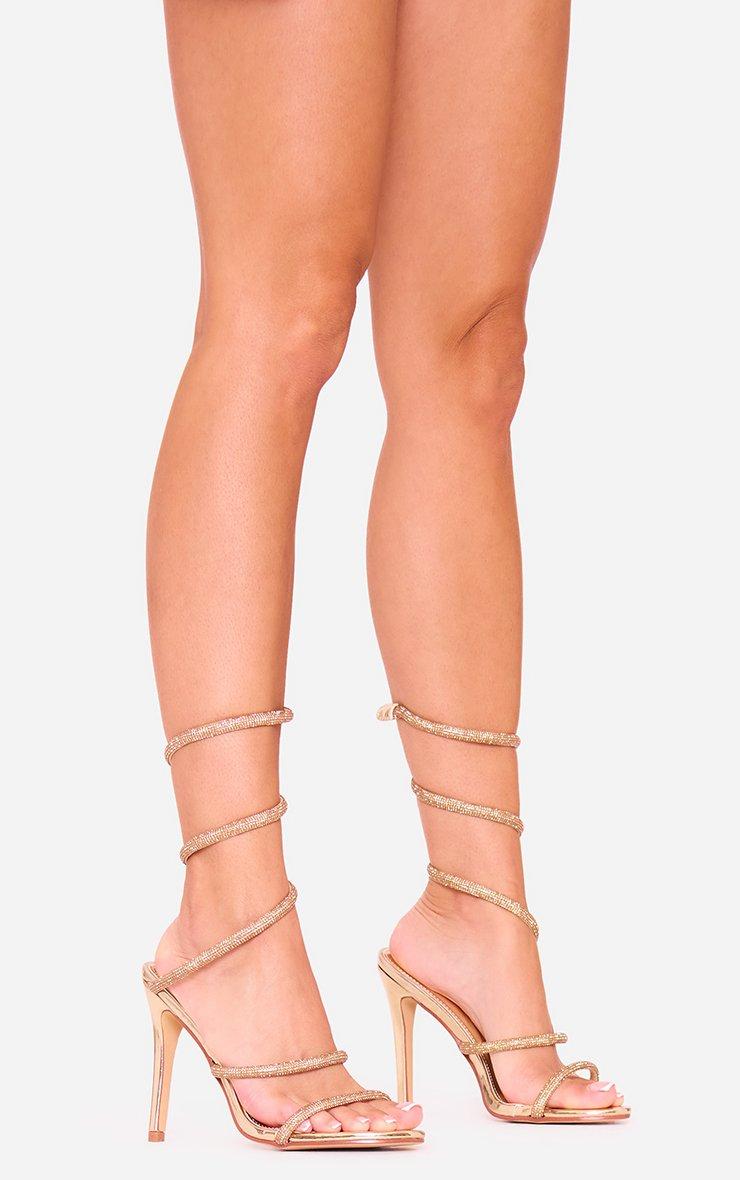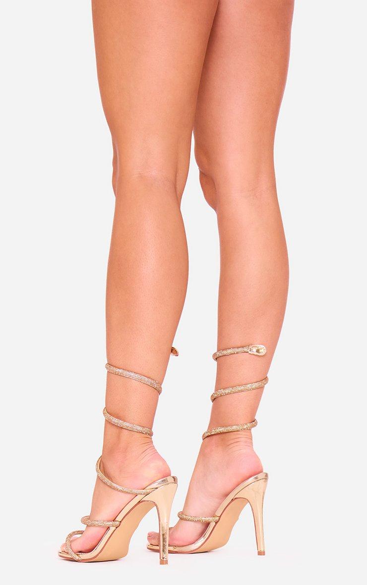 Shine bright with gold faux leather featuring riser diamante wrap-around strap detailing — these stiletto heels add luxe sparkle and major sass to your outfit, doll.