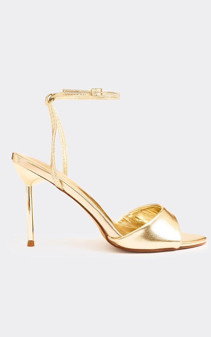 Statement-party vibes, doll. Featuring gold faux leather material with peep toe and ankle strap detailing, these stiletto heels bring bold it-girl energy. Pair with a mini dress or co-ord set for ultimate boss-babe vibes.
