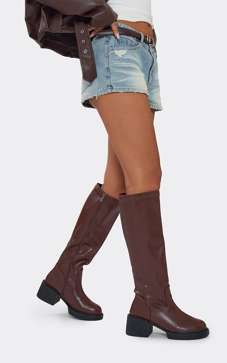 Caesar Chunky Block Heel Knee High Long Boot In Brown Faux Leather
